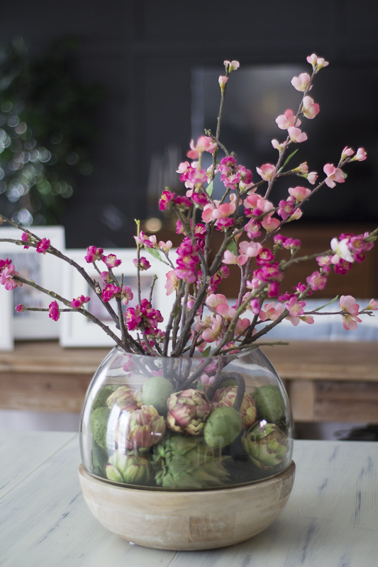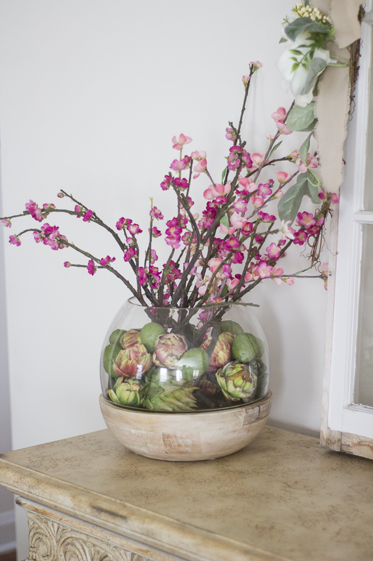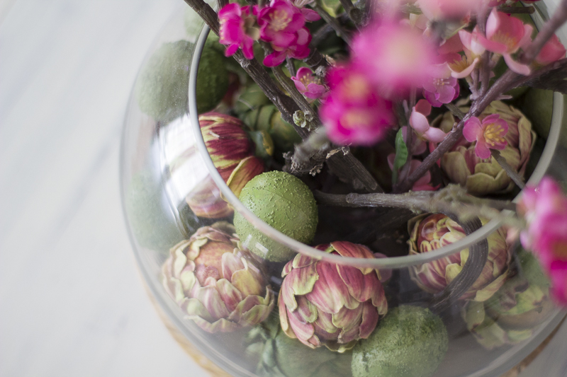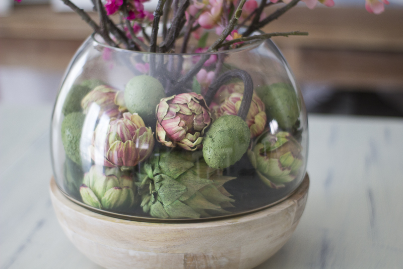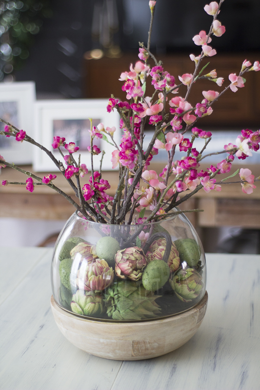 I took some faux branches I already had and placed them inside the bowl. I then started filling the bowl with faux artichokes and the mossy eggs.