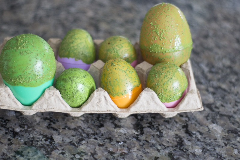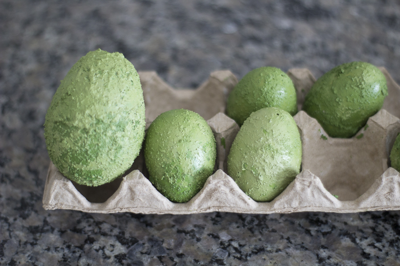 I made sure to wait for them to dry before applying a second coat. After the second coat of the darker green, I did a final third coat with the light green. Isn’t it so cool? I know it looks kinda gross but it really does give off a mossy look. The application is so easy and worked well on these cheapo eggs. My friend said they reminded her of the wicked witch’s face from Wizard of Oz.