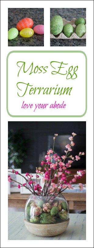 My friend, Adrienne bought me this cool terrarium for my birthday last year and I thought it would be perfect to create this Spring arrangement using the mossy eggs.
