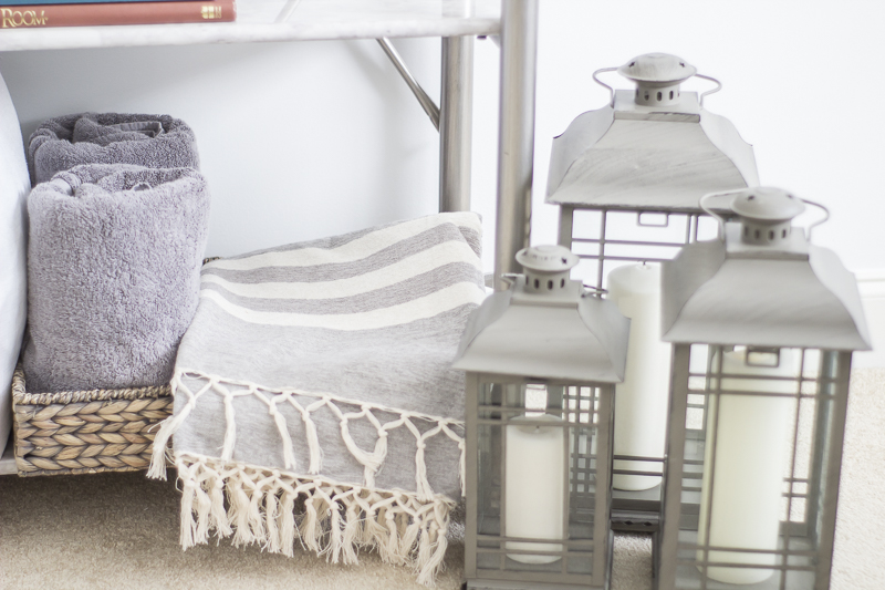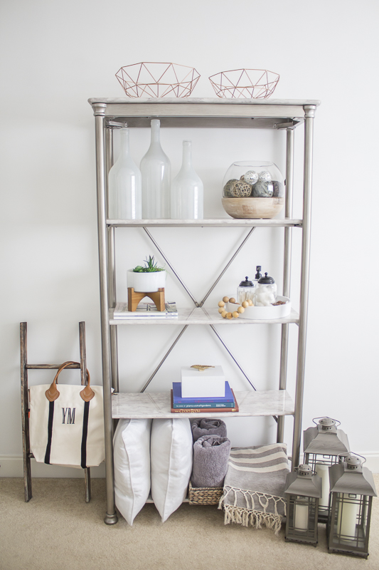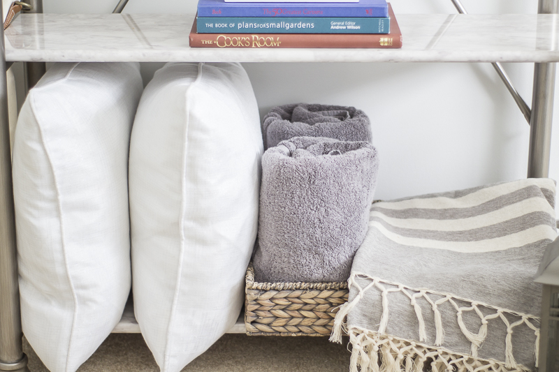 Since this shelf is in the guest room, I added towels, extra pillows and a knit cotton throw on the bottom. This way, guests can can feel free to use anything extra they may need or want. Keeping these items easily accessible allows our guests to feel more at home.