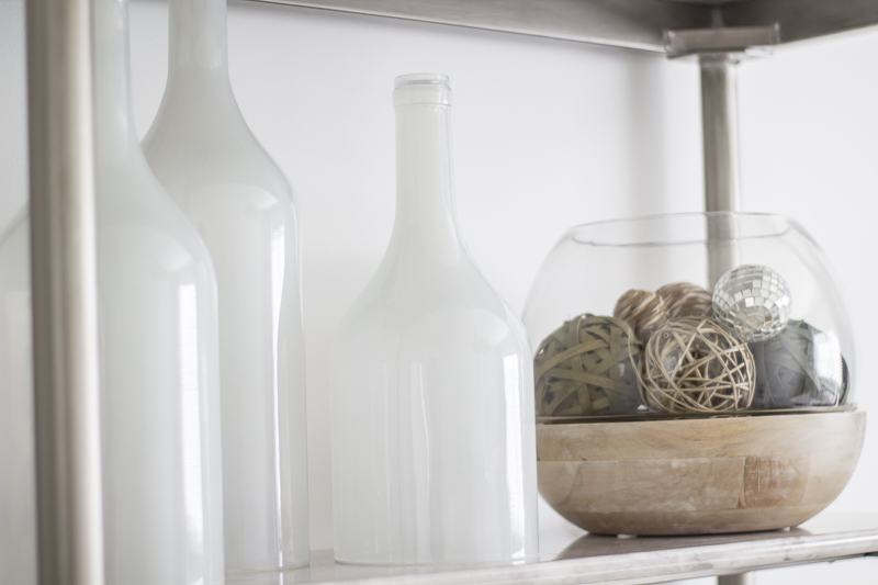 The beautiful cloche glass bottles add some visual interest and height to the large bookcase. The terrarium bowl also adds some depth to the shelf.