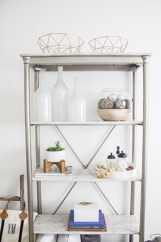 I have been a huge fan of Hayneedle for some time now because they offer a variety of home decor, furniture, lighting and many other home related goods at reasonable prices. They recently reached out to me to partner with them on a fun bookshelf styling post and I was ecstatic to join them along with 3 other bloggers. For my bookshelf choice, I went with this gorgeous Homestyles multi shelf in gray and faux marble. It has a clean, classic design and I loved the large size of this particular shelf. My favorite part is the faux marble shelving that appear like the real thing.