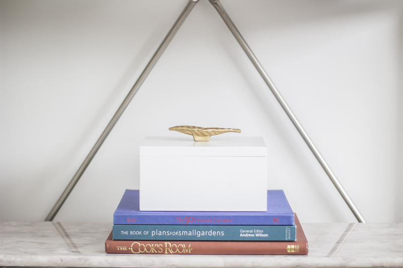 Since it’s a bookshelf, it makes sense to add books. I used books I thought our guests would enjoy reading and they include a variety of topics. You could also add some fiction or non-fiction books, magazines or other coffee table books. Books can also be used to add some height to decor pieces like this simple wooden box that can be served as a place to store jewelry or other items for guests.