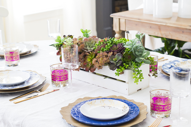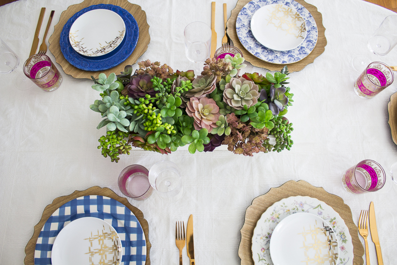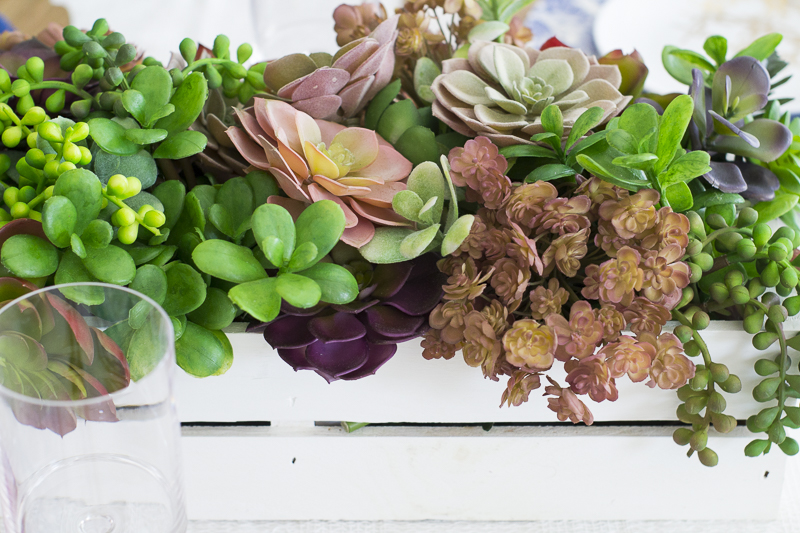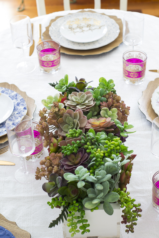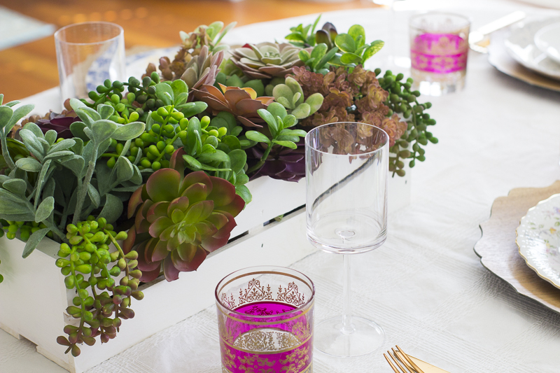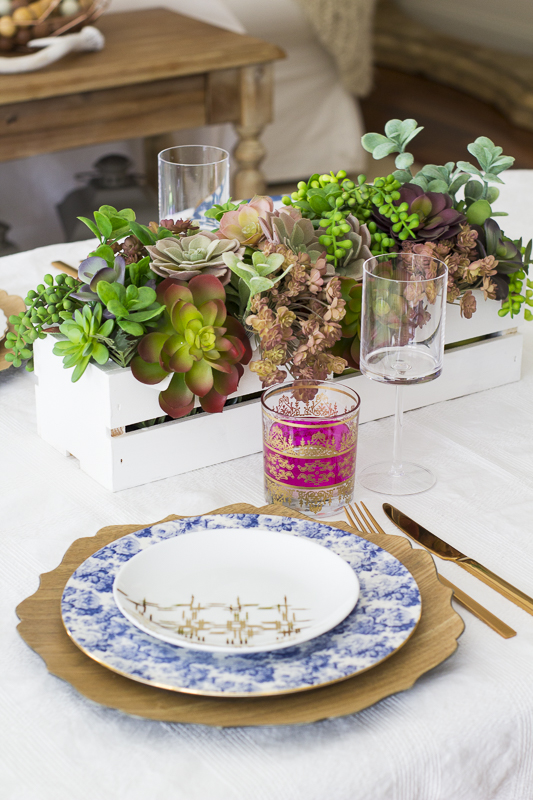 Since I had to go back to the store to purchase more faux succulents, I had a little light bulb moment. I decided to create a centerpiece for my table using a bunch of faux succulents and a wooden crate box I had on hand. Well, you know how my brain works because one thing led to another. I created the succulent centerpiece and then decided I needed to make a tablescape.