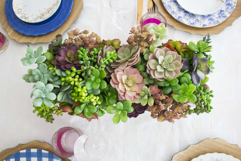 Hey friends! Hope you had a wonderful weekend. Last week, I shared a picture of a succulent wreath I made for my friend on Instagram and Facebook. I was blown away by how much love it received. I’ve already gotten a few orders so I’ll be busy making some more this week. Today, I’m sharing my faux succulent tablescape.