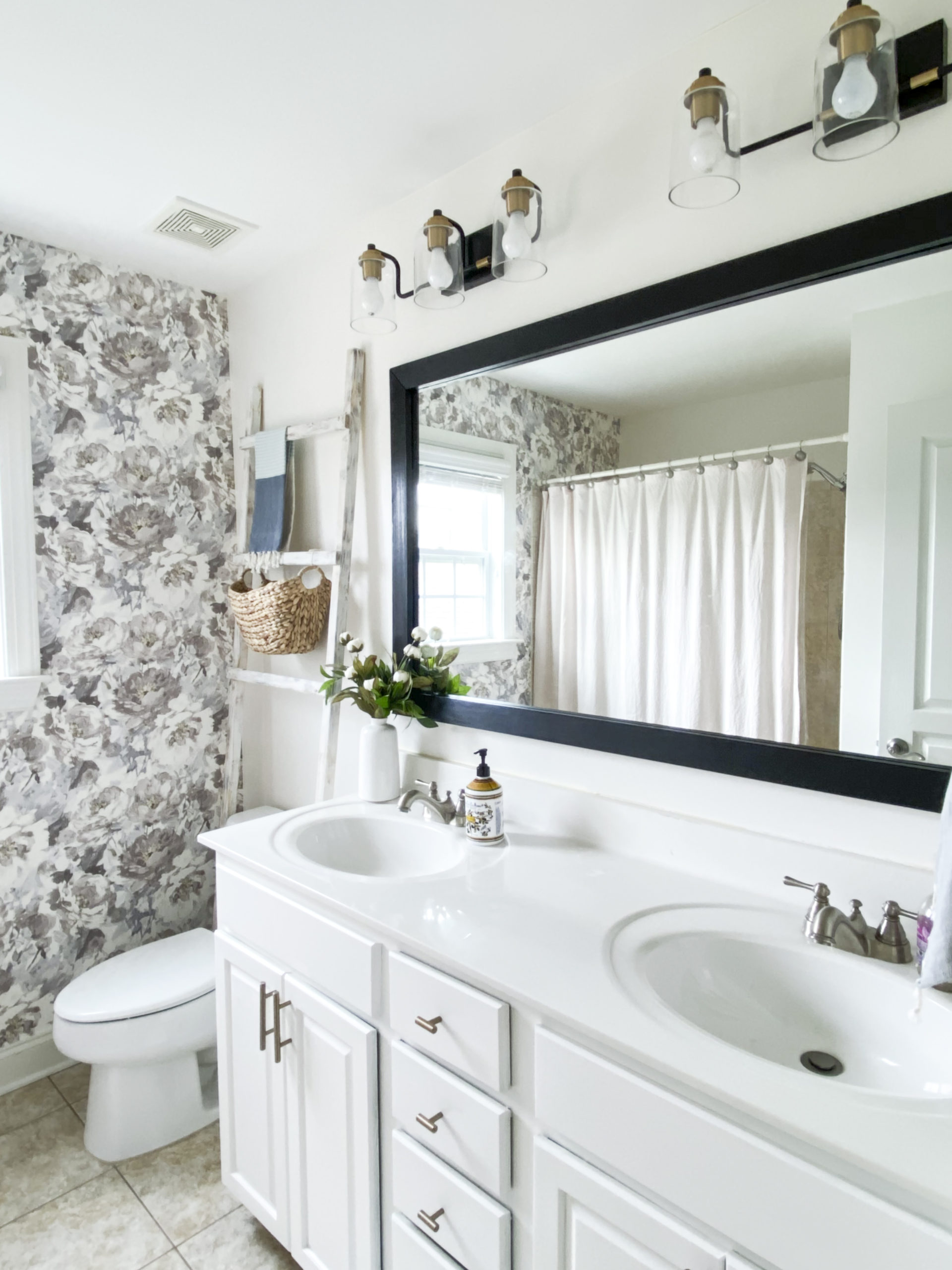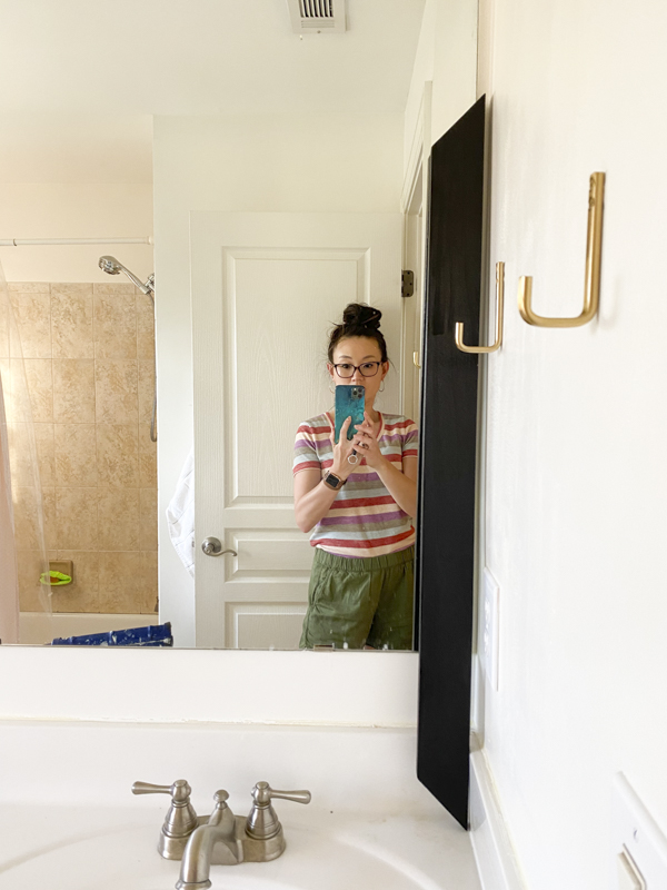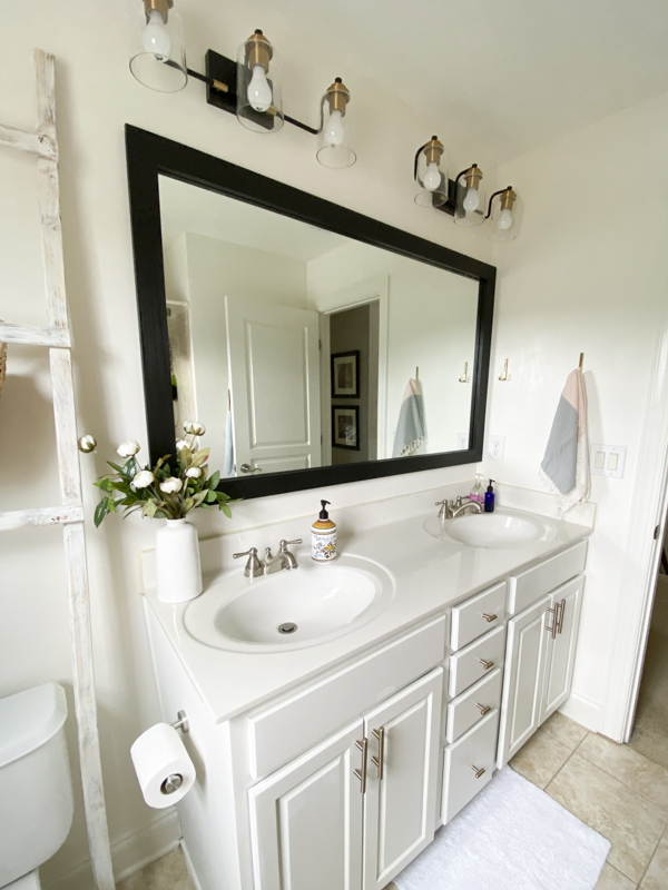 Not bad right?? I think the wood alone cost less than $15. That’s a whole lot cheaper than finding two new mirrors. Plus, I love how the black plays off the vanity lights.