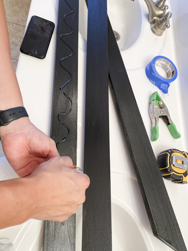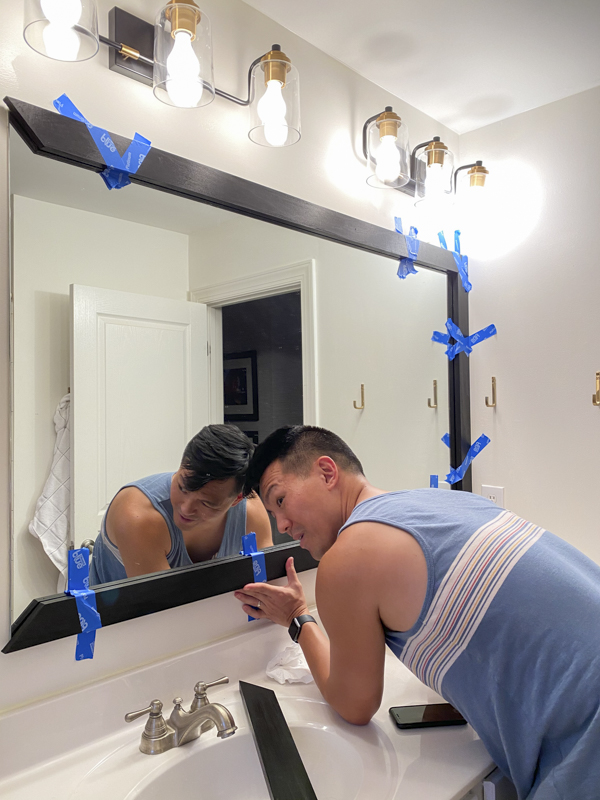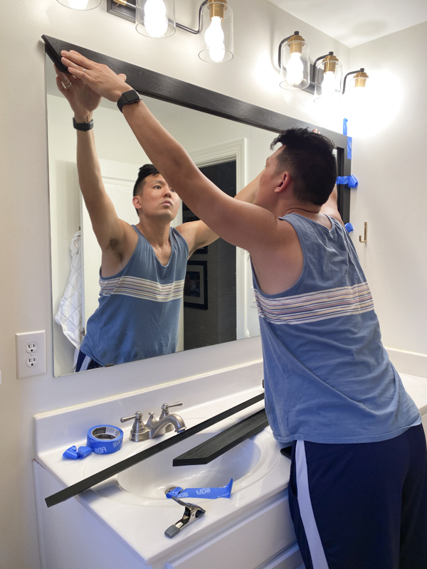 Make sure you put the wood pieces up on the mirror to make sure they meet at the appropriate corners. It’s always good to cut a bit longer than too short!