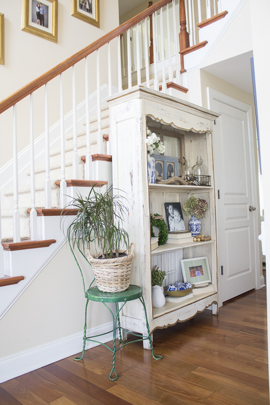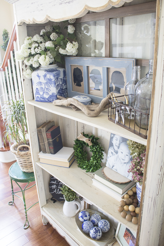 Our foyer received some changes when we moved the rustic bookshelf from the kitchen to this area. I mixed in some decor along with the DIY silhouette photos of my kids. The blue and white pieces add a cohesive look with all of the rustic pieces.