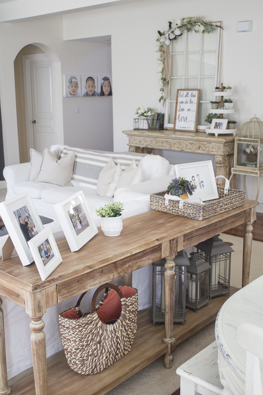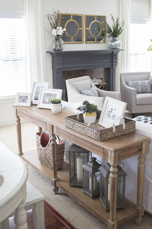We have an open concept home so that means the family room, breakfast area and kitchen are all basically one large area. I love the openness of the space as this is where we all tend to hang out and do life together. That big basket under the console table holds all the crayons, markers and colored pencils. I love combining function with style especially when it comes to organizing.