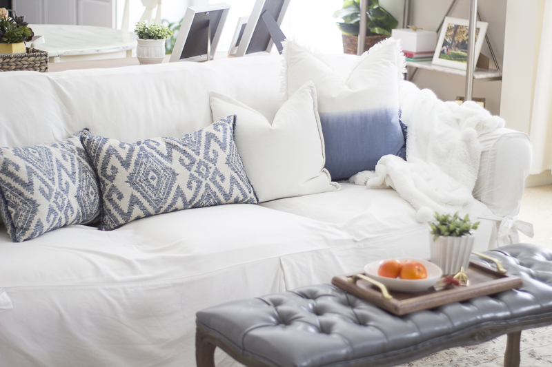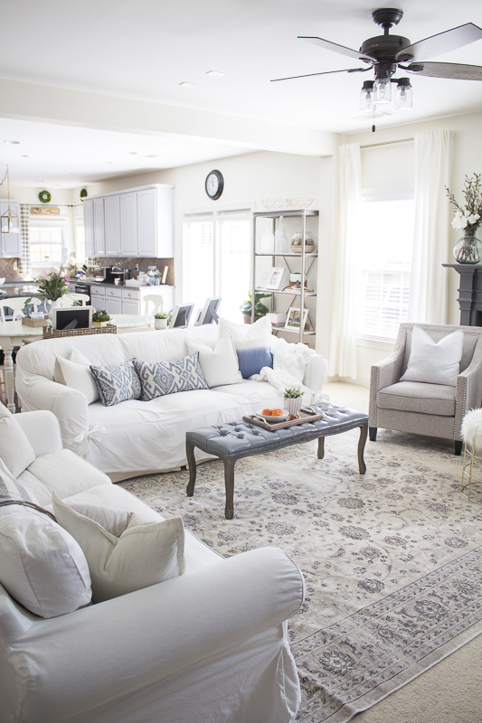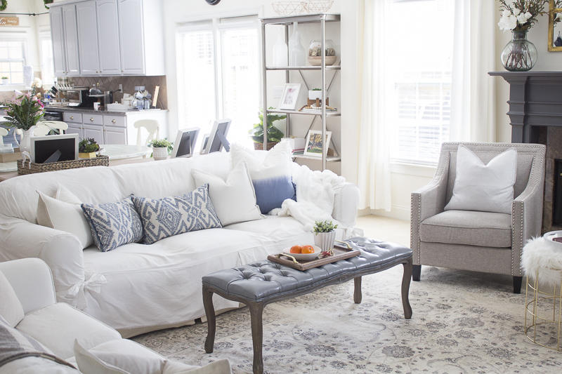 The family room is mostly neutral with pops of blue. I love adding real and faux plants everywhere as they bring life to a space.