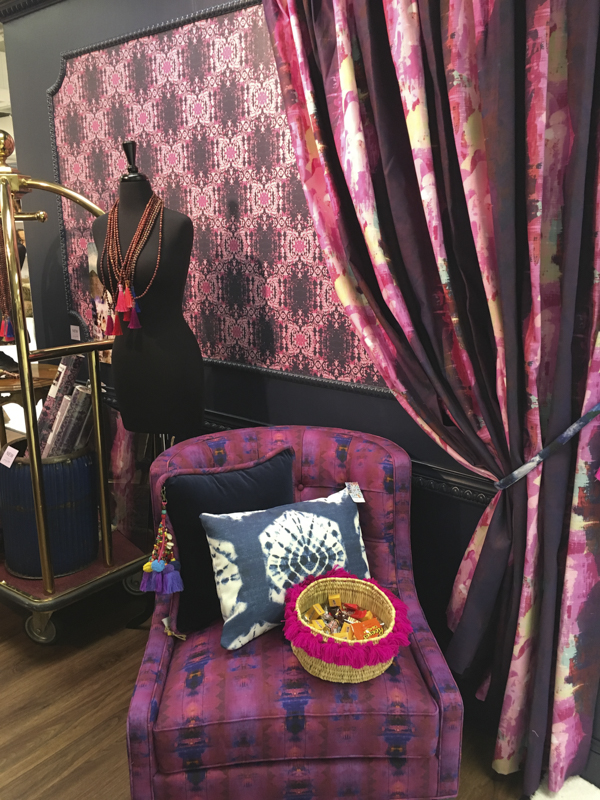 Remember my beautiful Christmas stockings from that same fabric on these chairs? We visited my friend, Kellie Smith’s booth and it was beautiful! So much color, drama and pattern mixing. She sponsored our Christmas blog hop tour with these beautiful new textiles that she’s selling now.