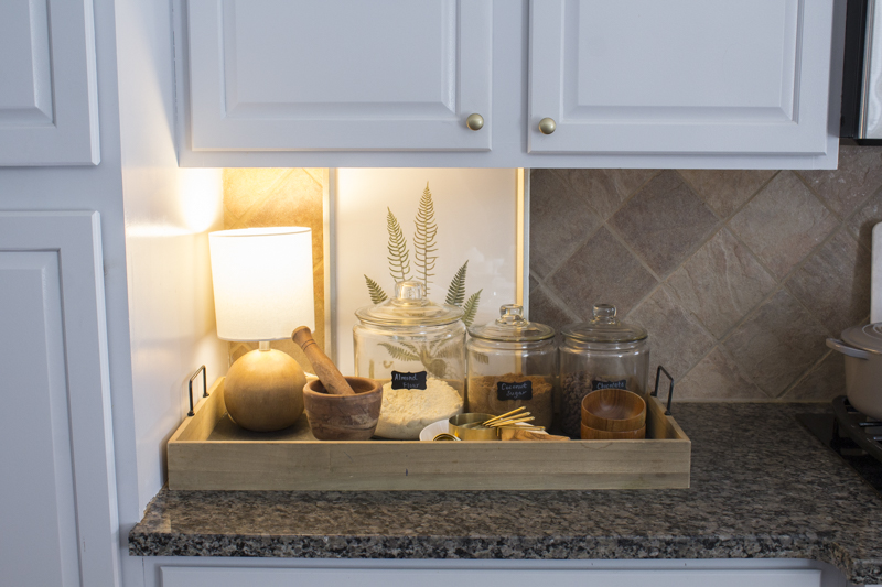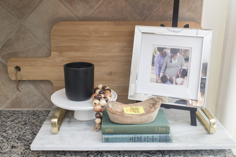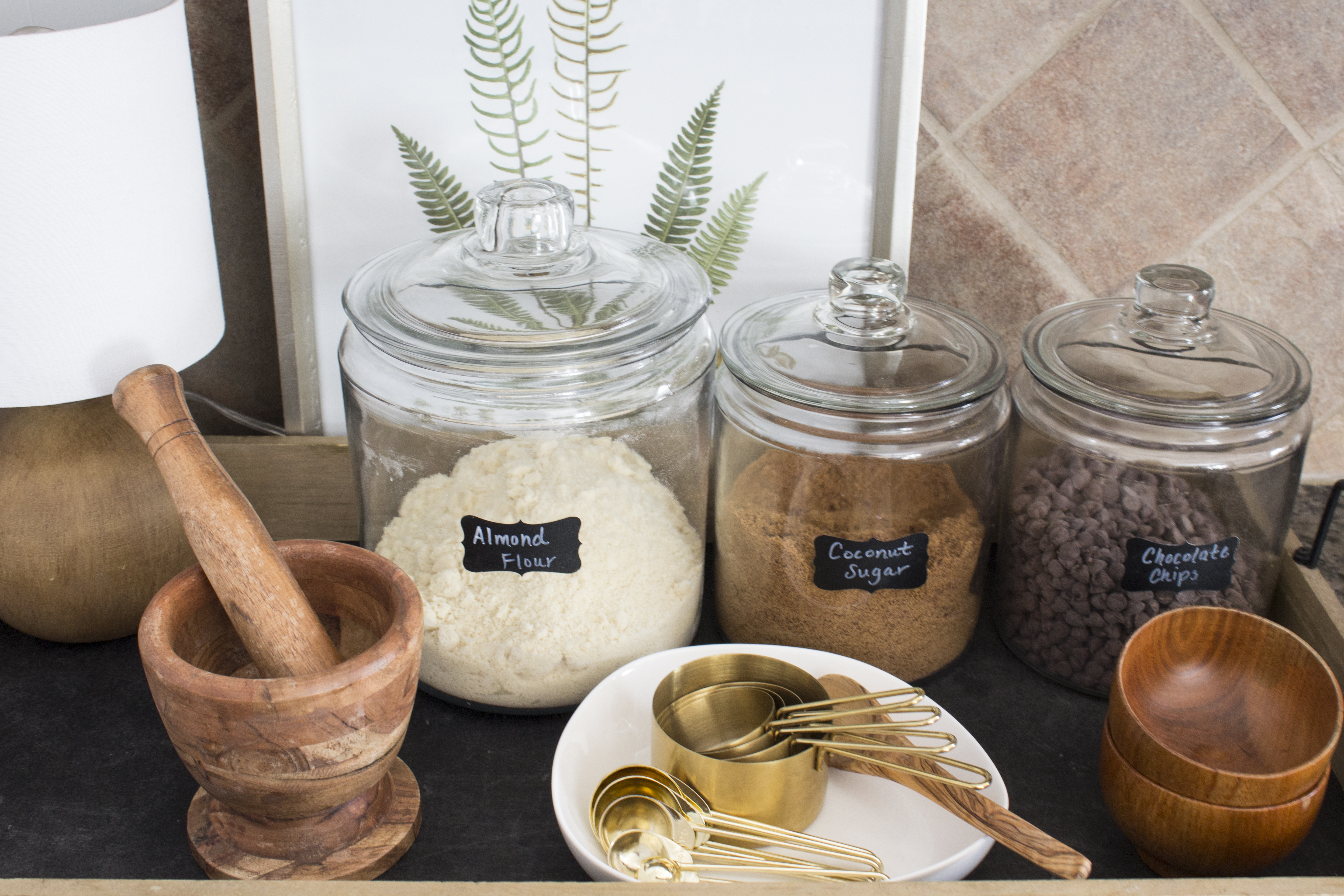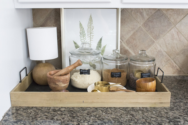 Once Autumn comes around, I start baking twice as much as the summer months because we love everything pumpkin. Keeping the most used ingredients out on the counter makes it easier for us to bake and it looks super cute. I placed them all on a tray to corral the ingredients together. Placing the gold measuring cups and spoons in a white dish makes it cute and easily accessible.