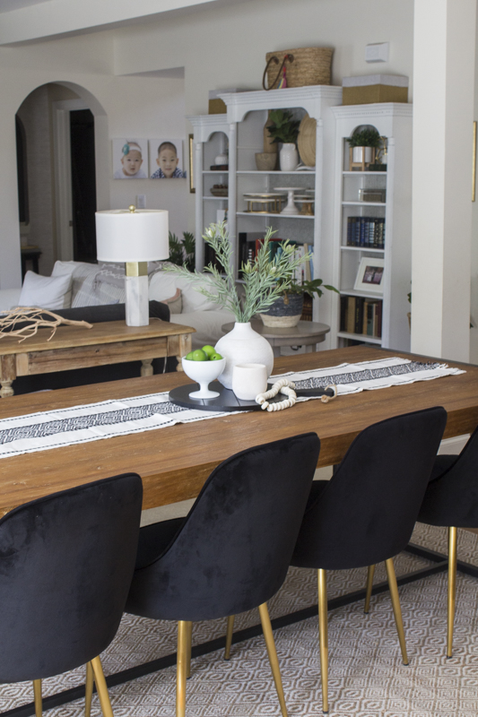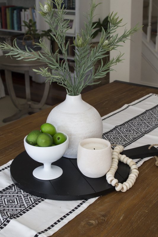 This black and white runner is neutral enough yet perfect for Halloween. If you don’t have a runner, add a blanket scarf or a piece of fabric on top of the table.