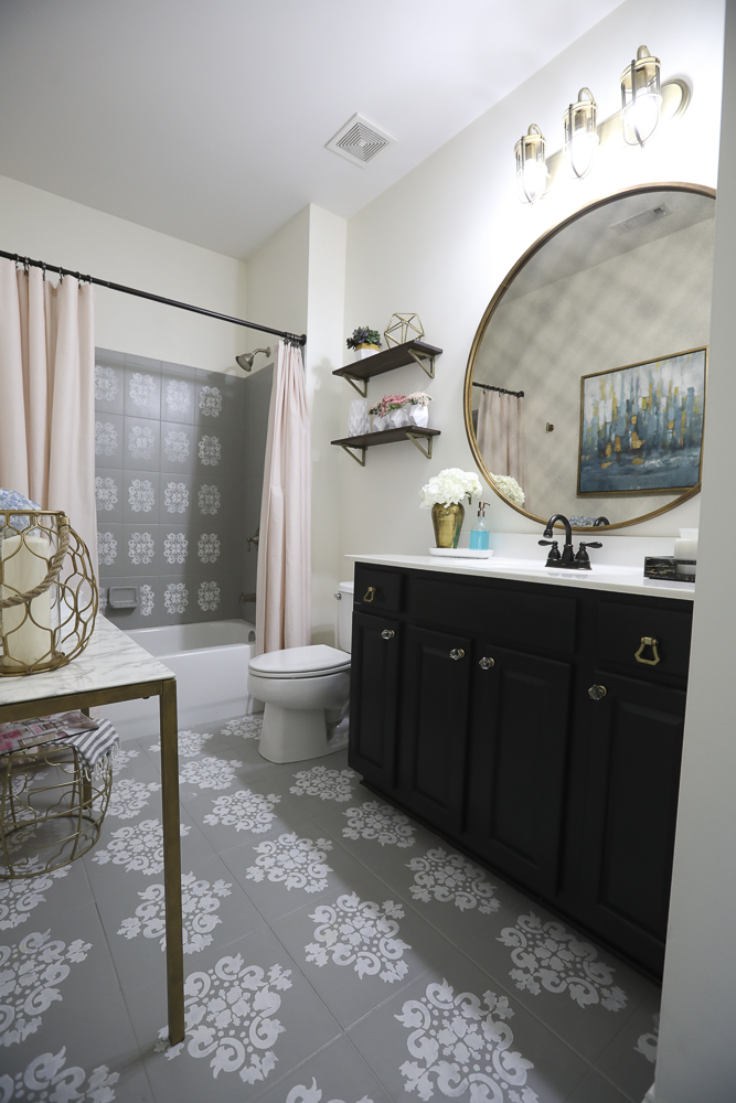 If you missed my One Room Challenge makeover, I transformed our main level bathroom into this. You can find the complete reveal post here. Yes, that’s painted tile! I have an amazing Instagram giveaway going on until Friday so be sure to go there and enter to win this same exact lighting. My friends over at Lighting Design Company have sent me 4 lights for our home and I love every single one of them.
