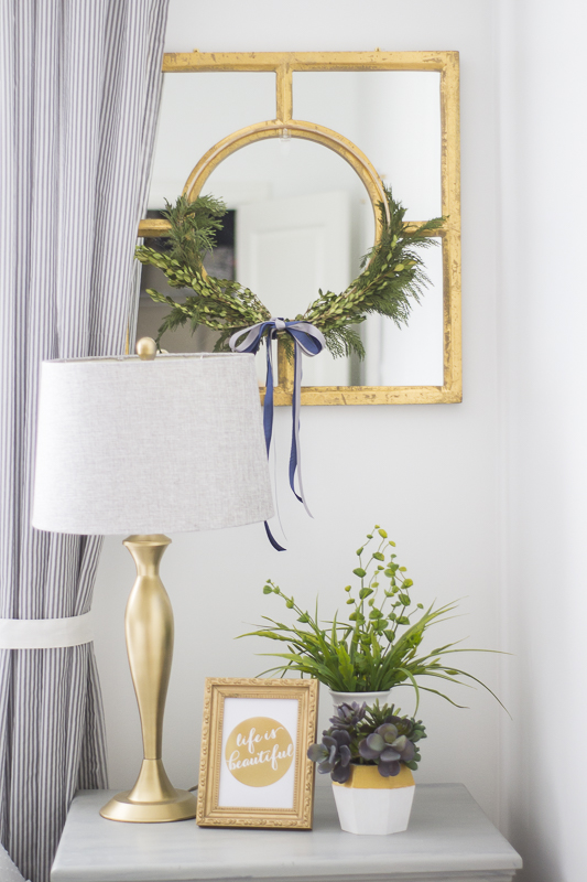 I added my DIY foraged minimal styled wreaths over the gold mirrors on both sides above the nightstands. I loved how the hoop fit the exact circle shape on the mirror. I even added some sparkly lights over the headboard. It’s the same one I used for my very ugly Christmas sweater.