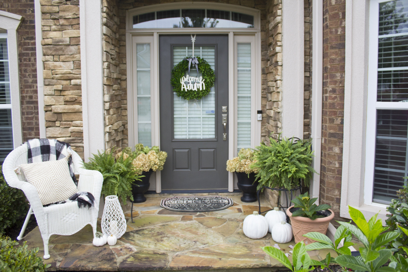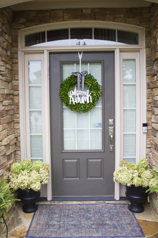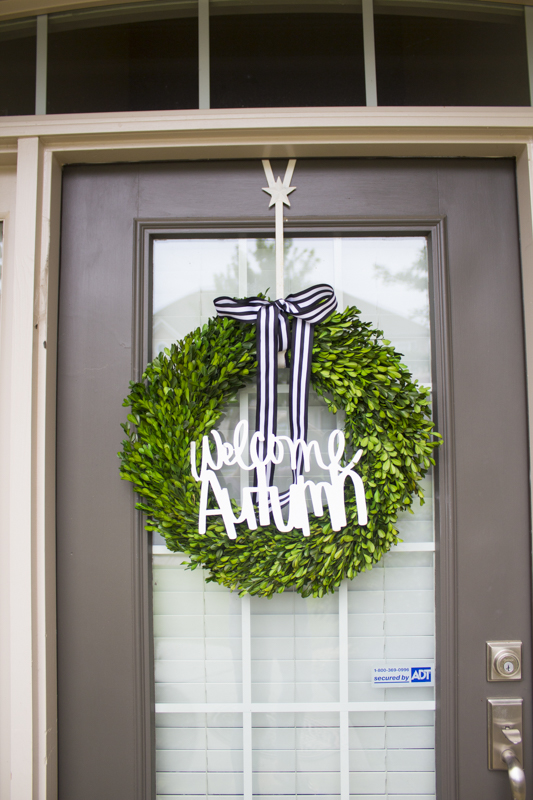 My friend, Brooke over at Start at Home Decor sent me her beautiful “Welcome Autumn” sign and I attached it to my boxwood wreath. I added a simple black and white ribbon and hung it on our door and I think it’s pretty darn cute. Brooke creates all kinds of wooden cut out signs and she is just so talented. Plus, she was one of my roomies at Haven and I just adore her. Be sure to check out her Etsy store and snag one of her signs because she always has amazing weekly deals.