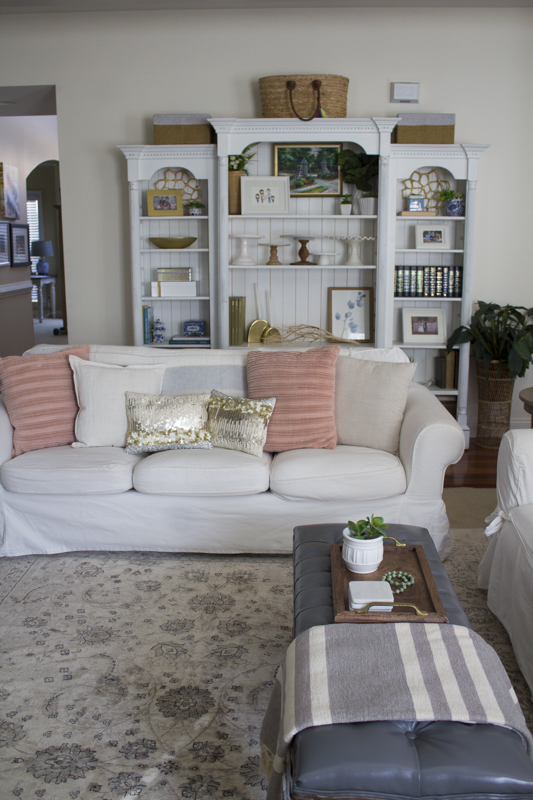 That gray paneled wall is such a beautiful addition to the room! And I love the pink pillows! Your home is so cozy but not fussy! Comfortable!