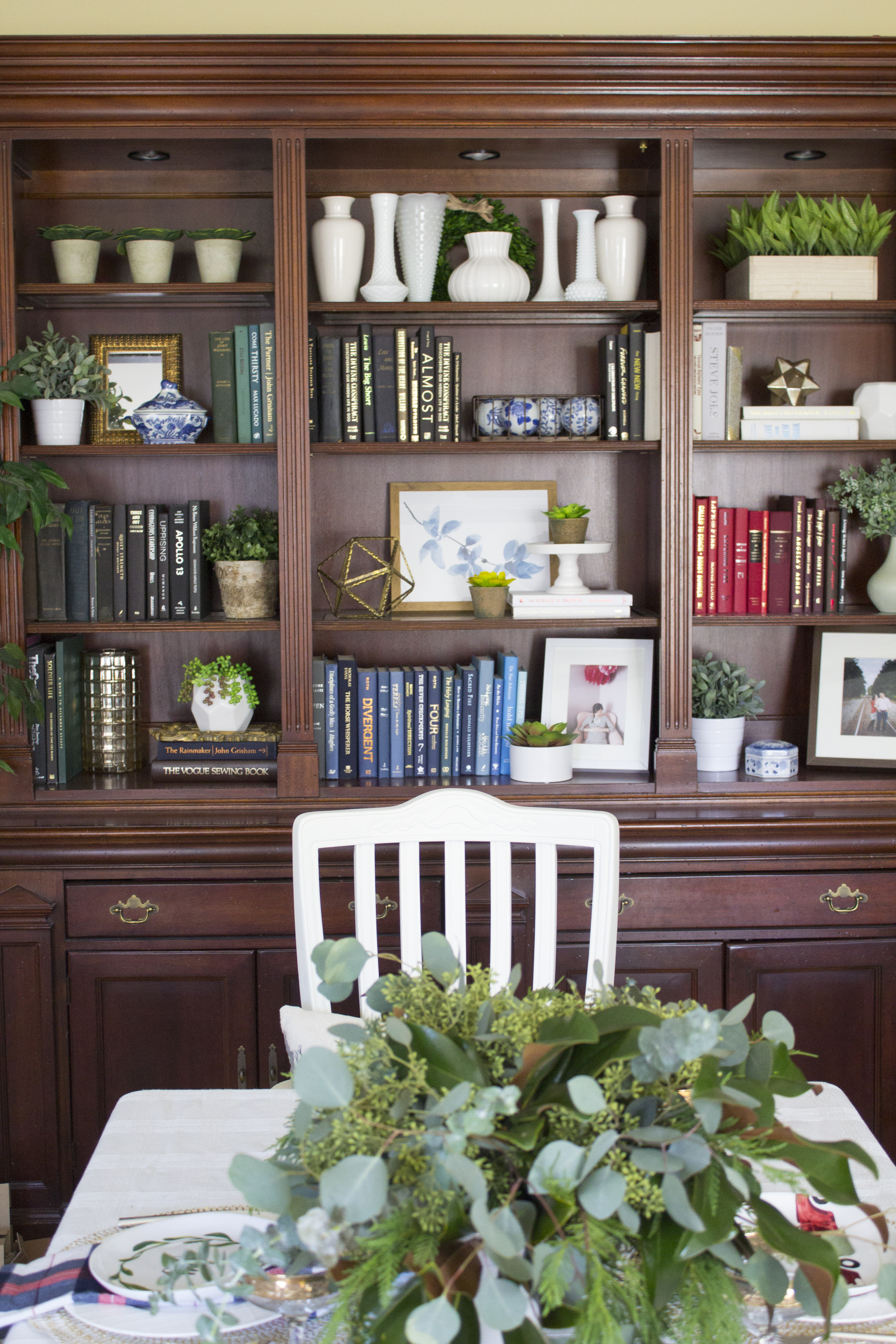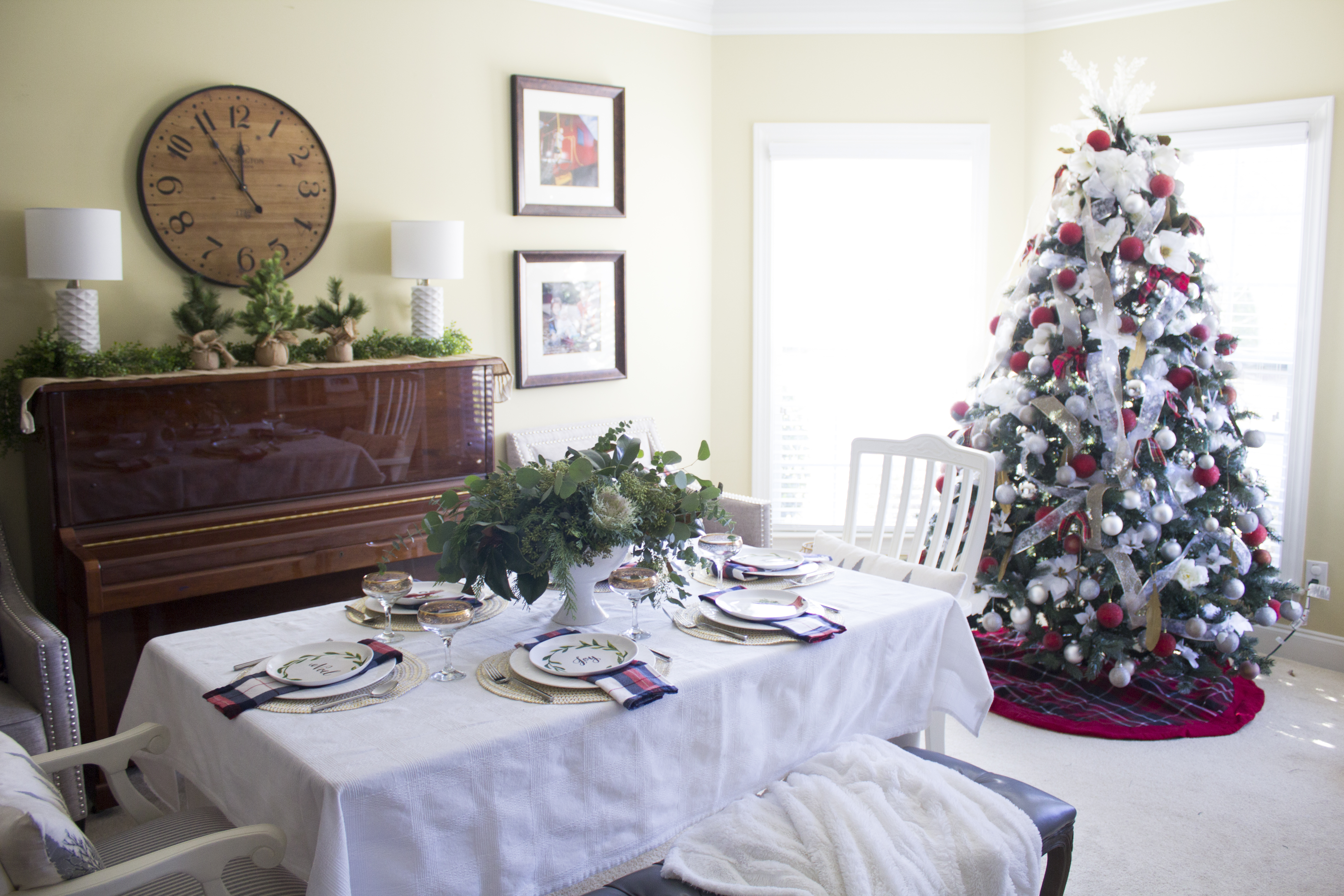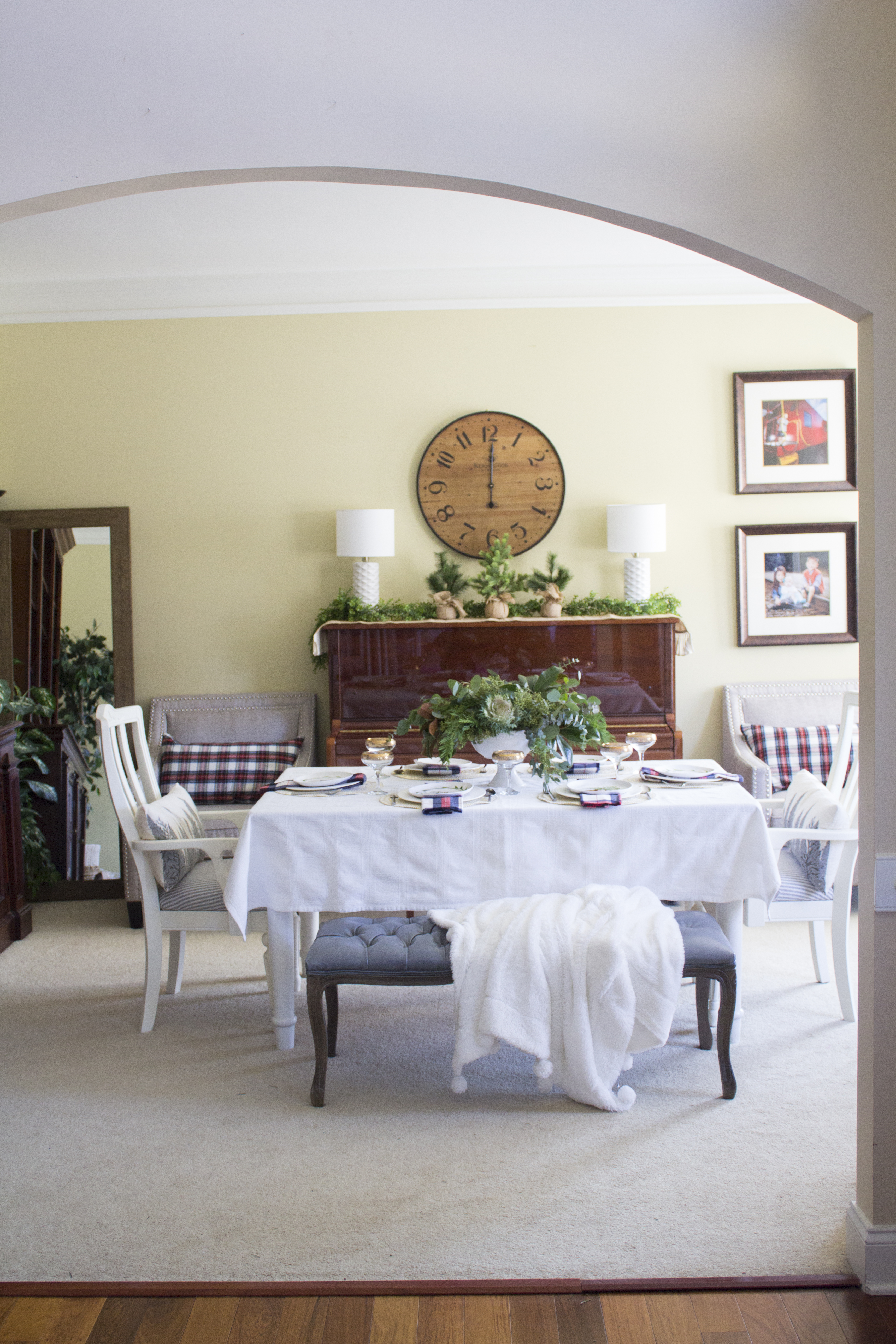 Across from the dining room is our piano room/den. This room served as the play room for over 5 years. I recently got rid of a bunch of toys and moved the rest upstairs into the media room. Now, this piano room serves as a study and I’ll be using it as my office starting in January. Since it already has a table, I thought I would add another tablescape because that’s what I like to do for fun. One day, I’ll repaint this room and get rid of the yellow/beige walls. We love adding a Christmas tree since the bay windows look out to our street.