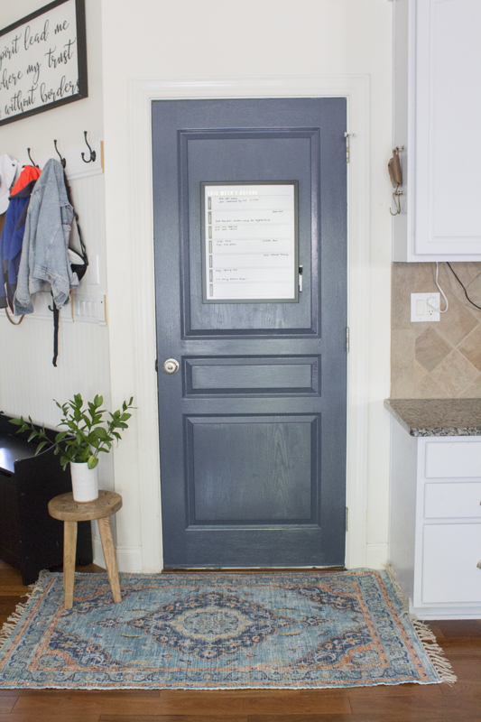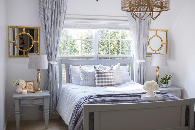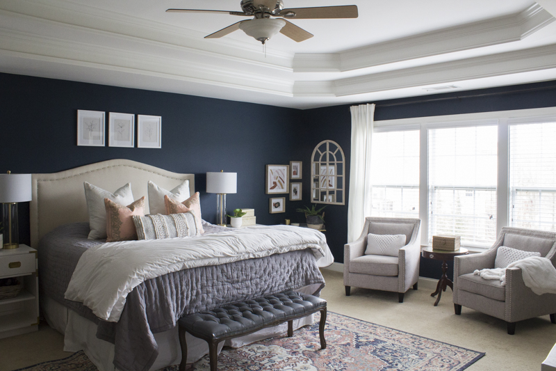 Our master bedroom walls are painted “Sailors Coat,” by Olympic. It is in an eggshell sheen and has a gorgeous dark navy hue that changes throughout the day.