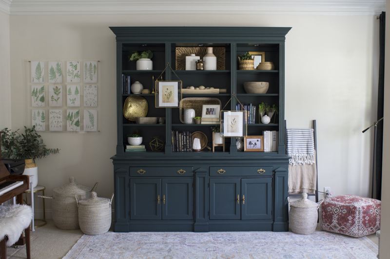 The walls in the piano room/office are Antique White by Porter. You can find details on this green bookshelf on this post.
