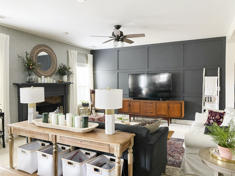 I used gray poplin peel and stick wallpaper for the backing of this bookcase in our family room.