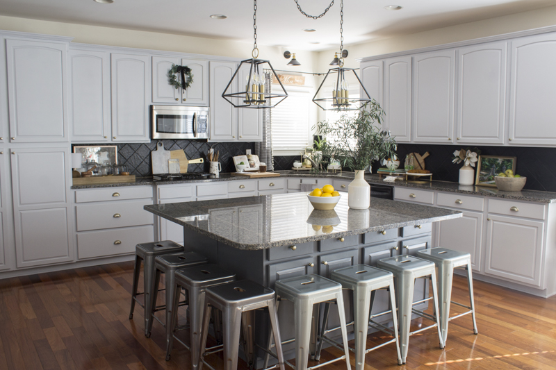 Our kitchen walls are Antique White by Porter and the cabinets are Gray Shimmer by Behr. The island cabinets are Dawn Gray by Behr in a satin sheen. The backsplash was painted Colonial black by Decoart and you can find more info on that here.