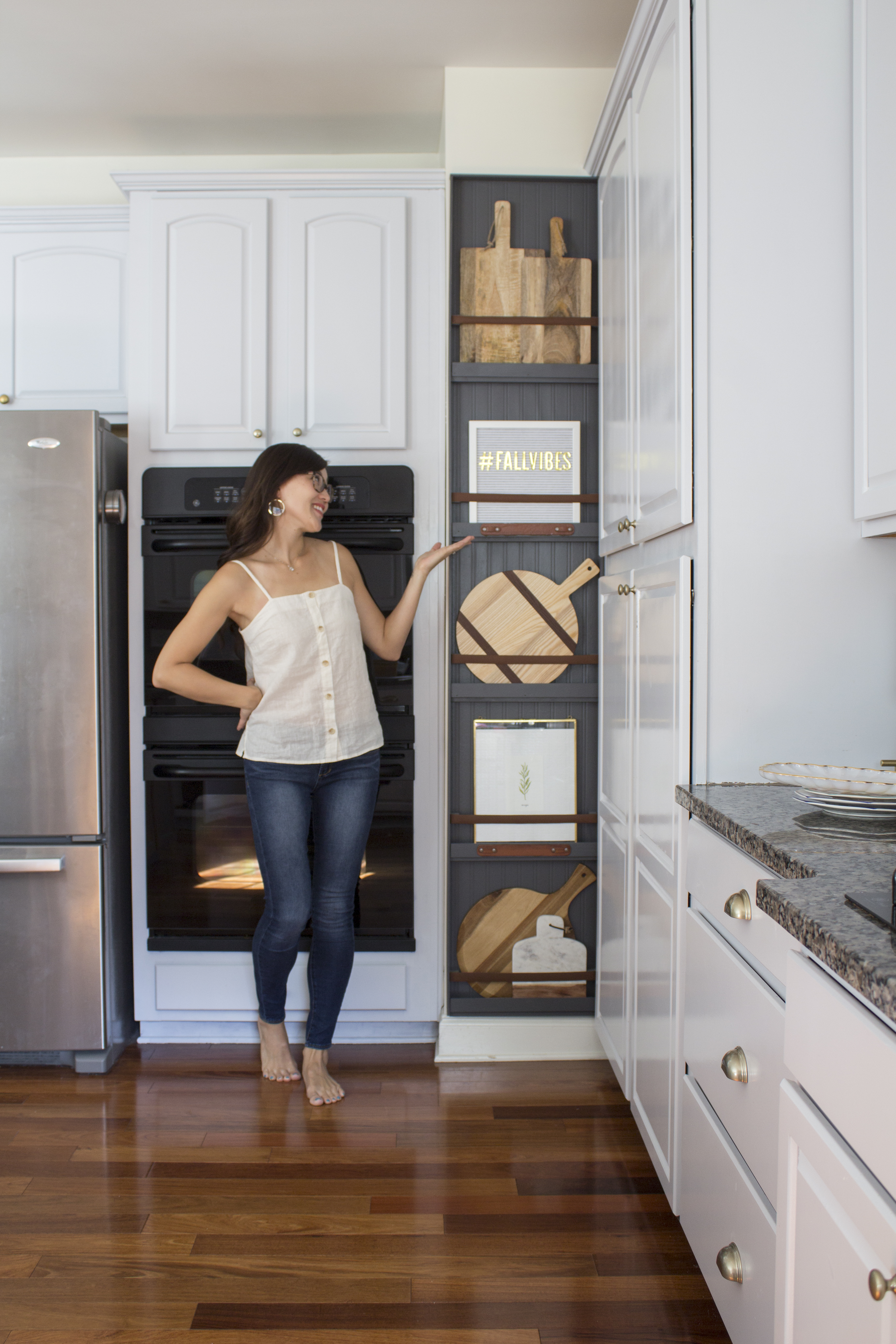 The modern DIY plate rack is painted Peppercorn by Sherwin Williams.