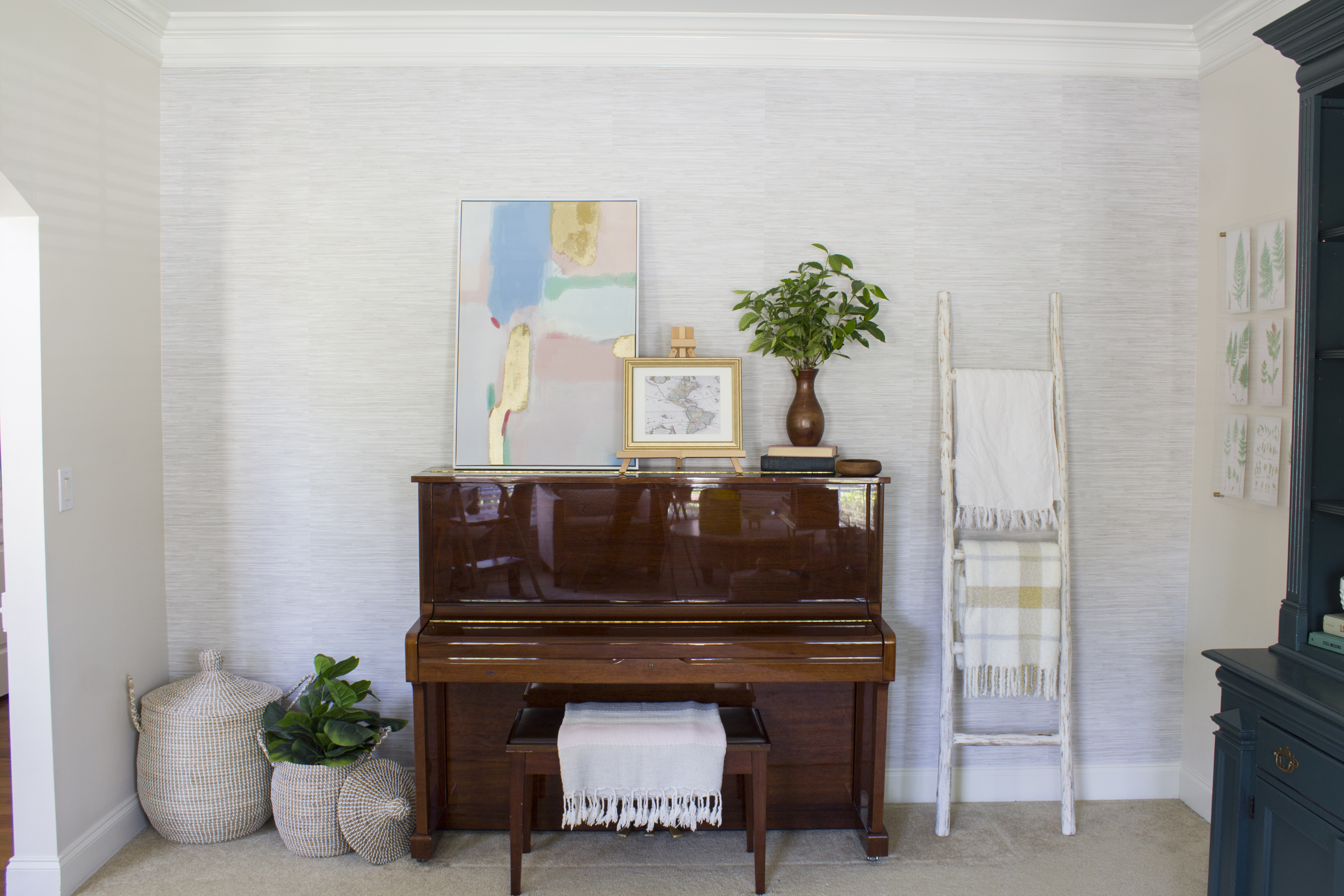 Our upstairs hallway went through a fun makeover back in February. The peel and stick wallpaper can be found here and it is fairly easy to install. I love the texture and subtle color this wallpaper adds to this space.