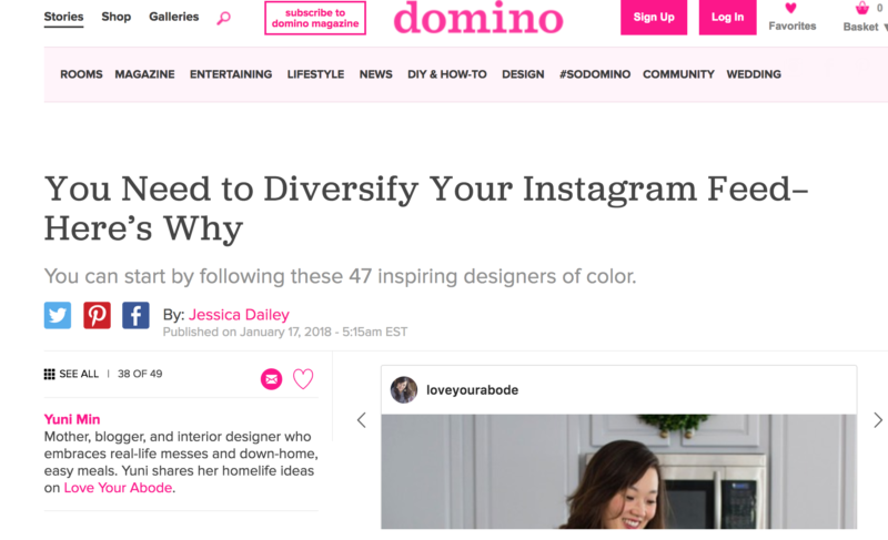 Last month, I was really surprised to find out that I was listed as one of the 47 designers of color to follow on Instagram by Domino magazine. I am a long time lover of Domino so I was flabbergasted and truly humbled. Do you want to hear something funny? Both my brother and my 8 year old son got excited and thought it was Domino’s pizza. HA!! Maybe one day, Domino’s pizza will recognize me for being a lover of good pizza but they probably could care less about my passion for design.