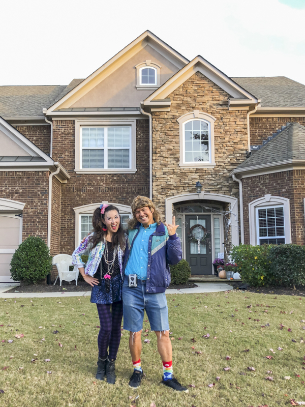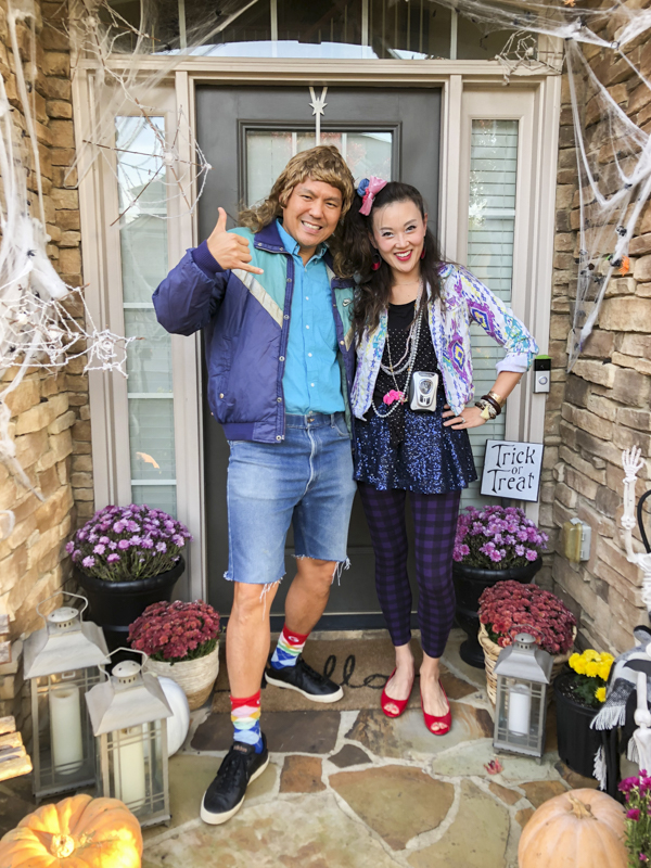 Fun fact: That hideous puffy retro jacket was the one my dad wore when he immigrated to the US in 1985. Crazy that we kept it right? It’s truly a vintage Nike jacket. We cut up a pair of my FIL’s short to make them into jorts and he was pretty much good to go. Those are his normal socks by the way. Ha! I wore my daughter’s skirt and just layered on all the jewelry and scrunchies I could find. I wanted to tease my hair up high in the front but it was a fail because I didn’t have a comb or hairspray.
