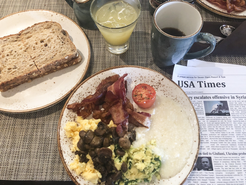 The breakfast buffet in our resort was free and it had a large variety of hot and cold foods. There is an omelette station and some of the foods get rotated. Ie: Pancakes, waffles, french toast, repeat. Okay, so this is another BIG tip. The first day we ate, our waitress told us we were each allowed to take to-go boxes. We were dumfounded because breakfast normally costs $30 which again, was included in our package. Jimmy asked like 3 people that morning to make sure it was okay and they were like, “yeah go ahead!”