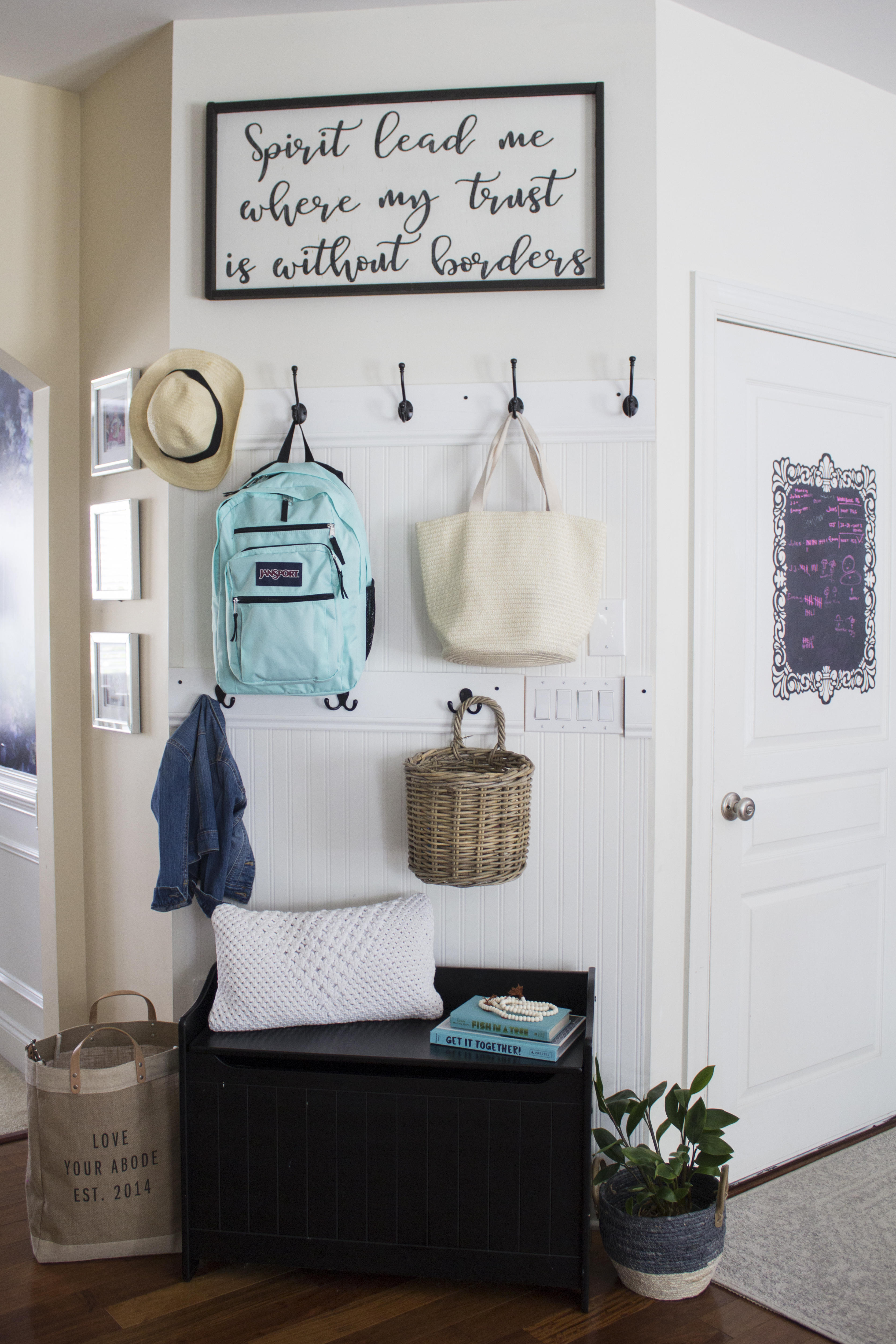 Years ago, we created a makeshift mud wall. Since we don’t have a mud room in our home, we really needed to create a space that would hold backpacks, library books, jackets and purses.