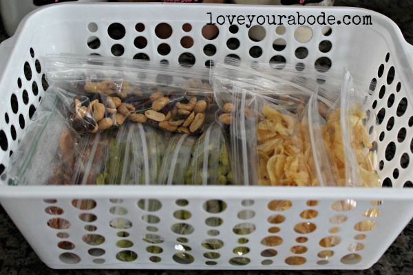 Before the school week, pack snacks and place them in a basket or container. I keep these in our cabinet pantry so the kids can easily place them in their book bags the night before school.