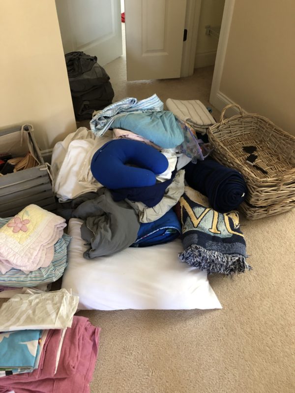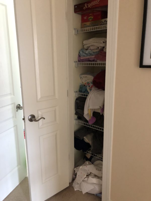 Finally one afternoon, I decided it was time. In true Marie Kondo style, I took everything out of that closet. I found old items like my college throw blanket, sleeping bags and random linens. This was the perfect time to go through all the items and get rid of things that weren’t being used in the last 6 months.