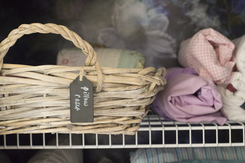 We used to hold a bunch of our board games in the linen closet but I decided to move them to another dresser in the hallway. I took some chalkboard labels that I had and attached them to each of these baskets. I kept like items together and now they are rolled nicely into each basket.