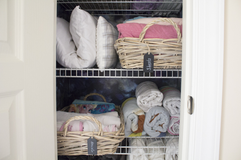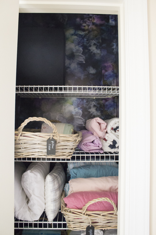 I bought 3 clearance baskets recently and knew they would be used for the linen closet. I also had some leftover peel and stick wallpaper from Boho Luxe Home and decided to use it for the linen closet. This part is obviously not necessary but it sure does make me smile every time I open that linen closet. I really believe it’s the small details that truly make a home even if you’re the only one that’s ever going to see and appreciate it.