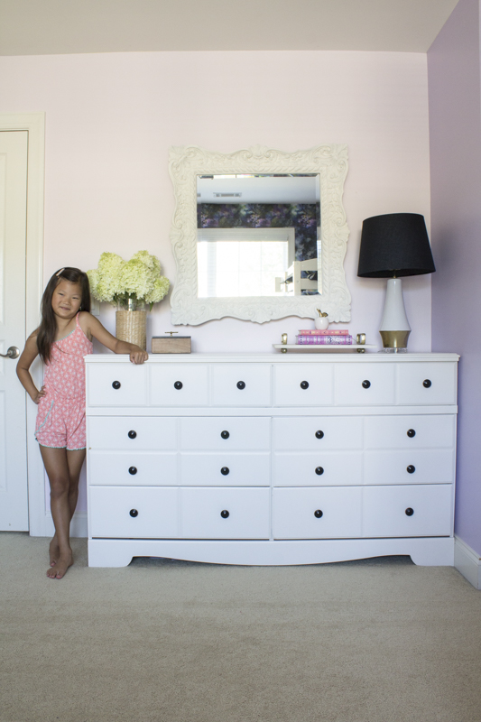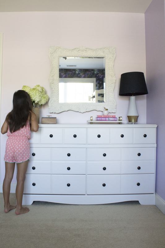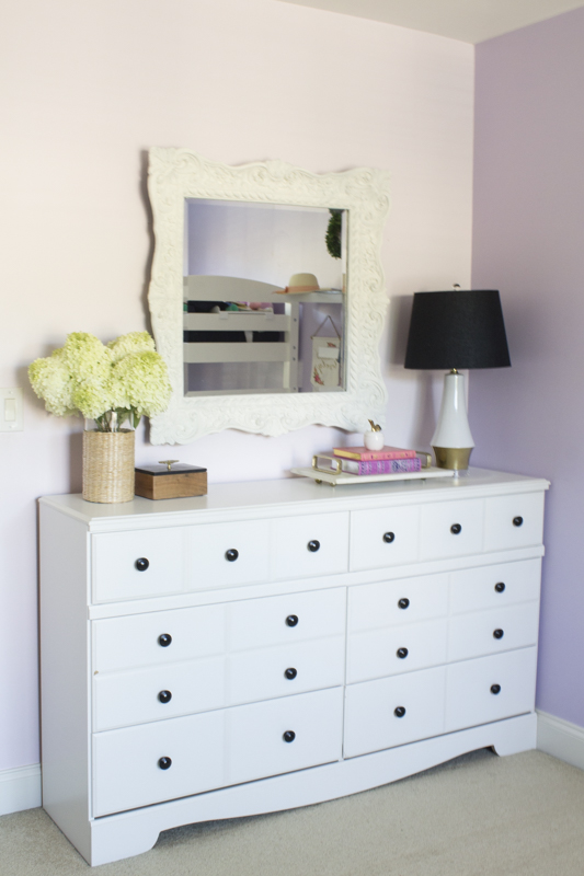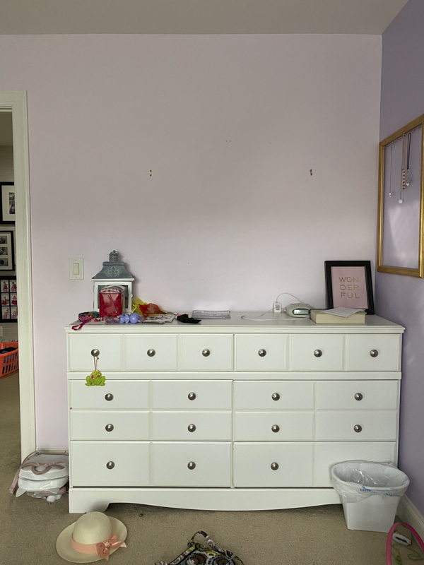 Emmy’s room has this white dresser that we purchased from Ashley Furniture almost 8 years ago. I don’t like buying matching bedroom sets but that’s what we did when Jules needed some furniture. Here’s how I spruced up this area in Emmy’s room and gave a simple dresser update with some paint.