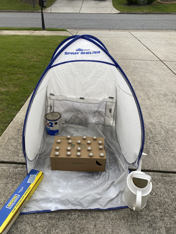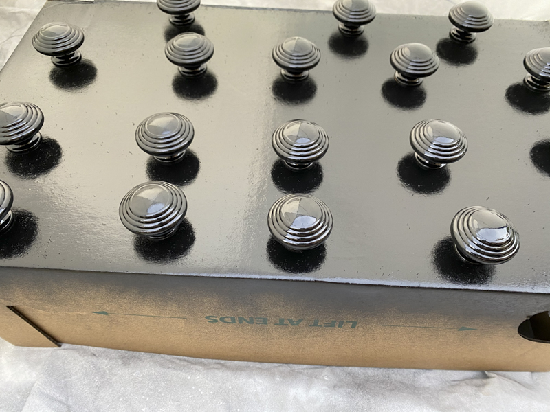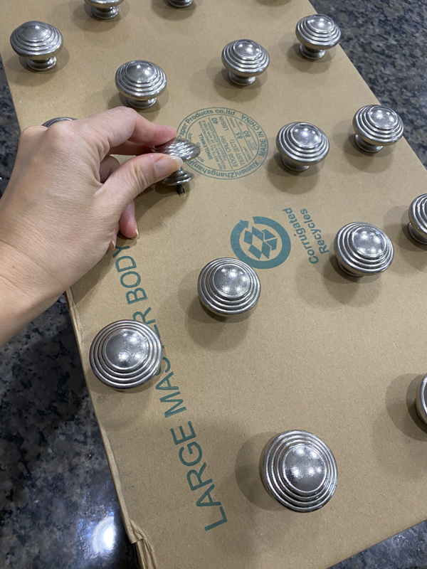 Here’s a tip to painting your hardware. Take a box or styrofoam and poke holes for your hardware to sit. This will allow you to have a nice even finish on the knobs.