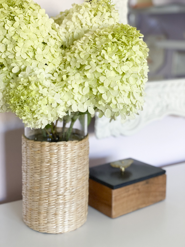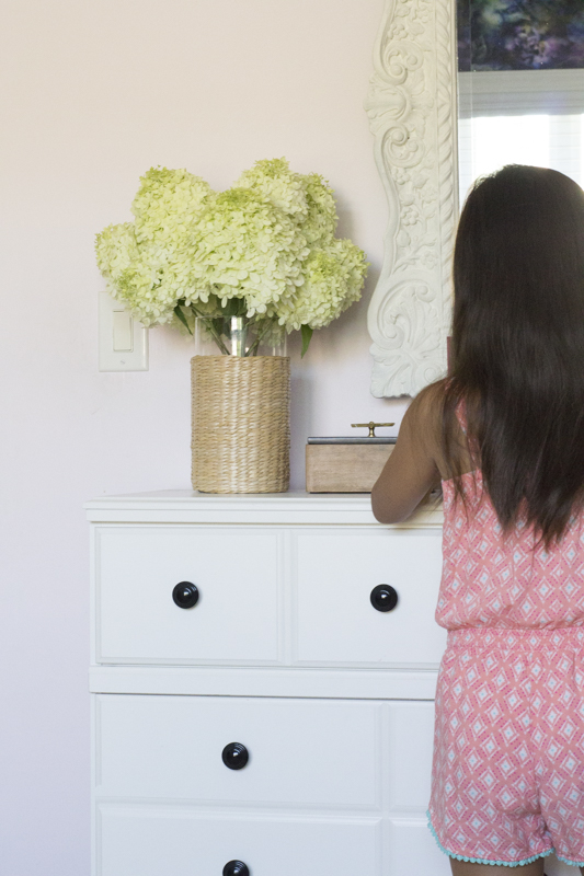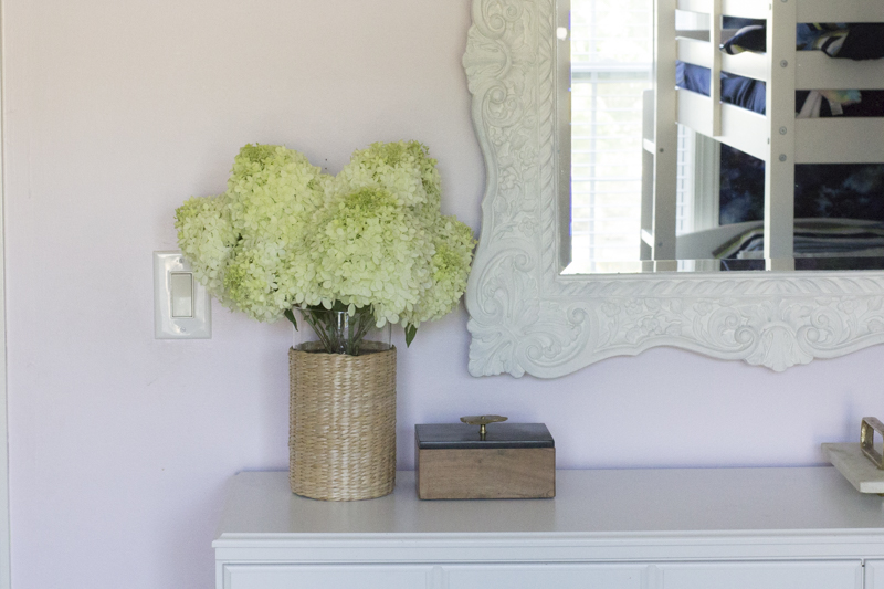 The mirror looks perfect here and matches the feminine aesthetic of the room. I’m so excited about our limelight hydrangeas that started blooming last week! You can check this post that has 5 easy tips for growing hydrangeas.