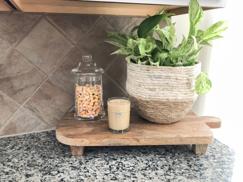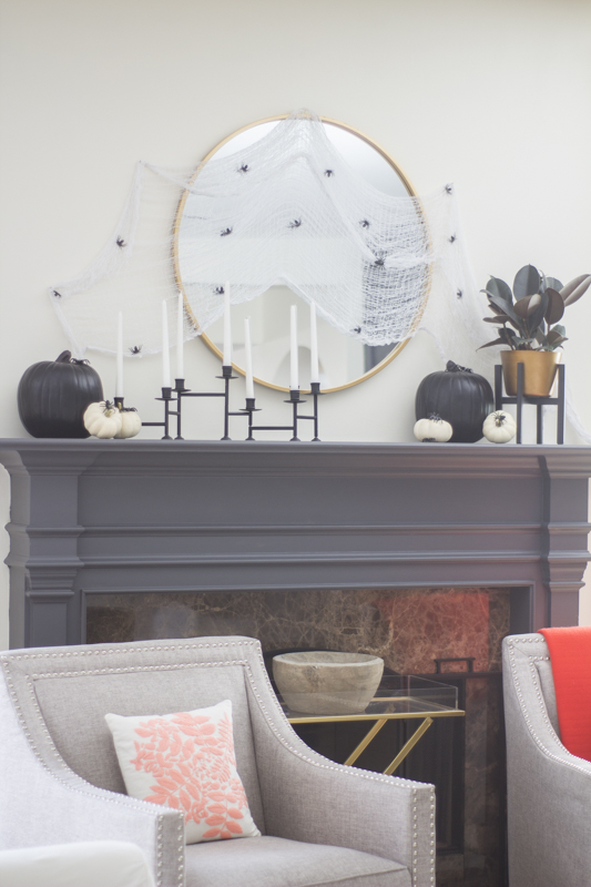 I added mini cream colored pumpkins along with the faux black ones from Joann. My sweet friend and neighbor, Adrienne gifted me with that awesome black candelabra for my birthday recently and it’s perfect up there on the mantle.