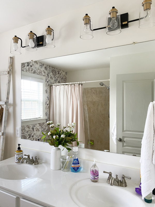We had some builder grade sconces that were out of style and just not our taste. I discovered these 3 head vanity lights and knew they would be the perfect upgrade. The best part is that they were only $85 each! That’s a steal for vanity lights. Some of my readers were asking for inexpensive vanity lights so I put together a little round-up of bathroom sconces for under $100.