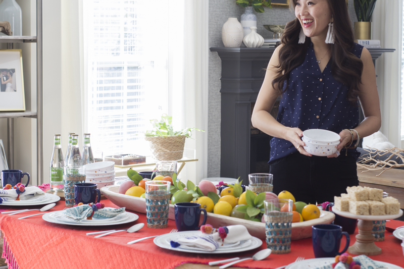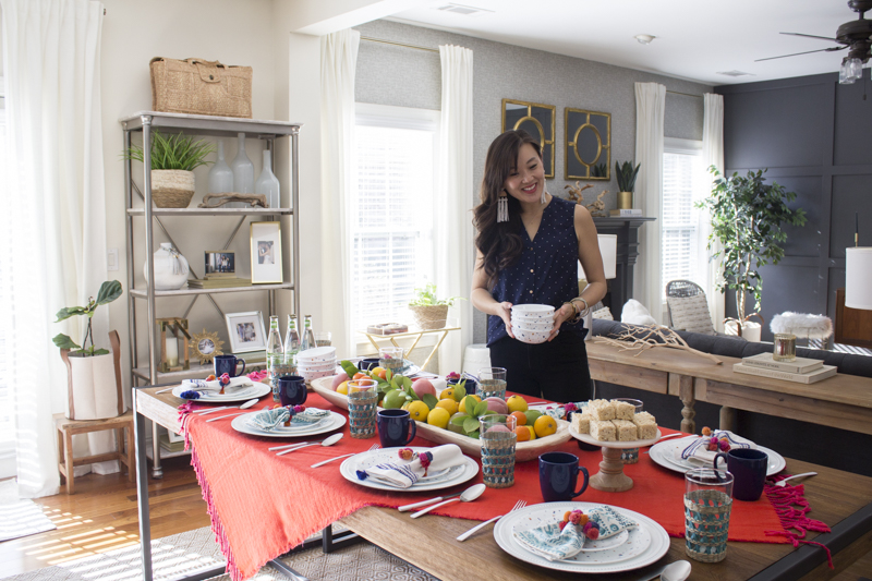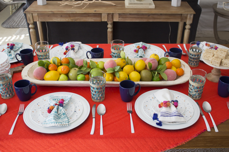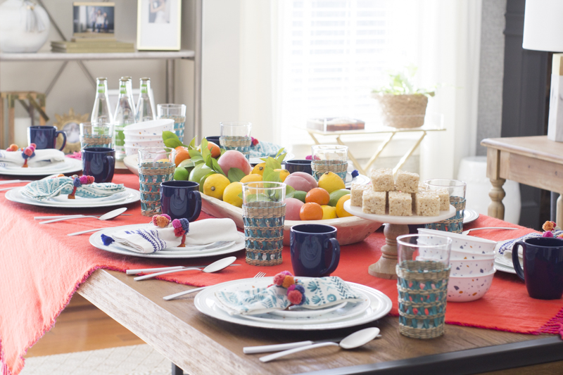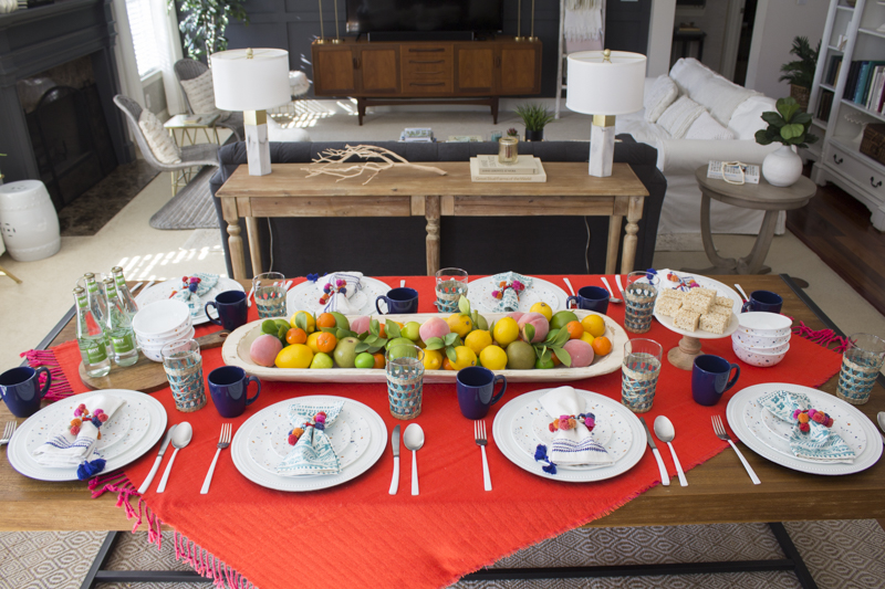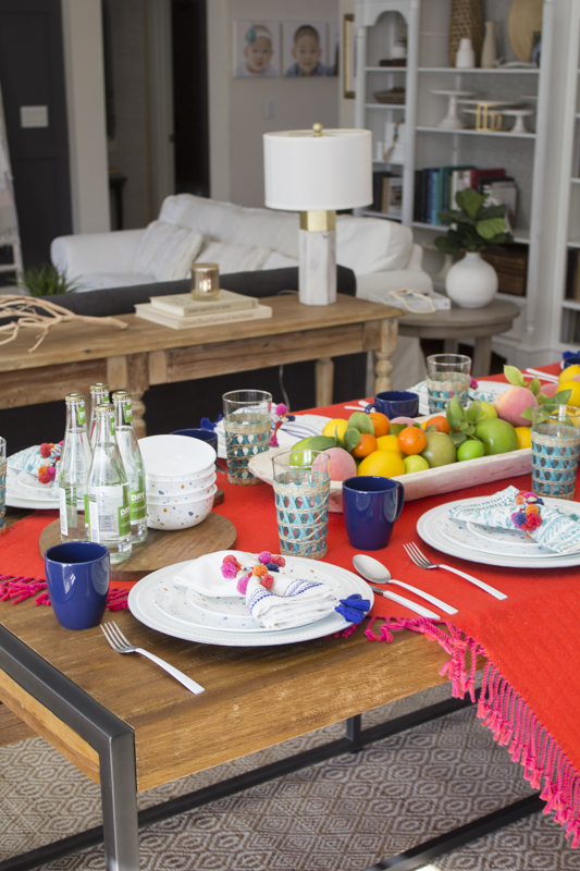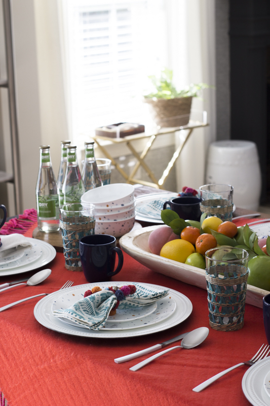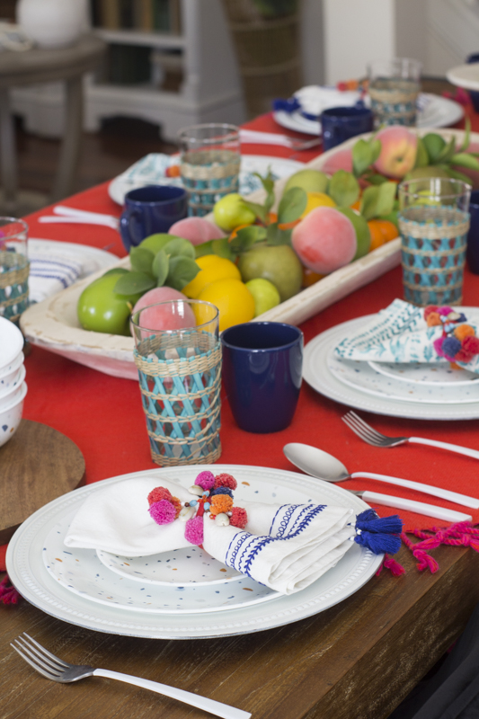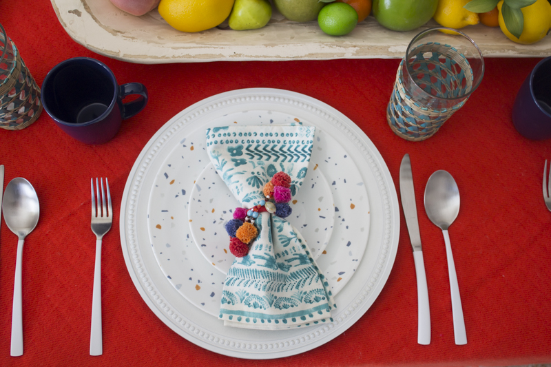I used my Corelle terrazzo dish ware but I mixed it up with two different napkin prints and used some really funky pom pom napkin rings. This is the time to jazz it up with a combo of colors and prints.