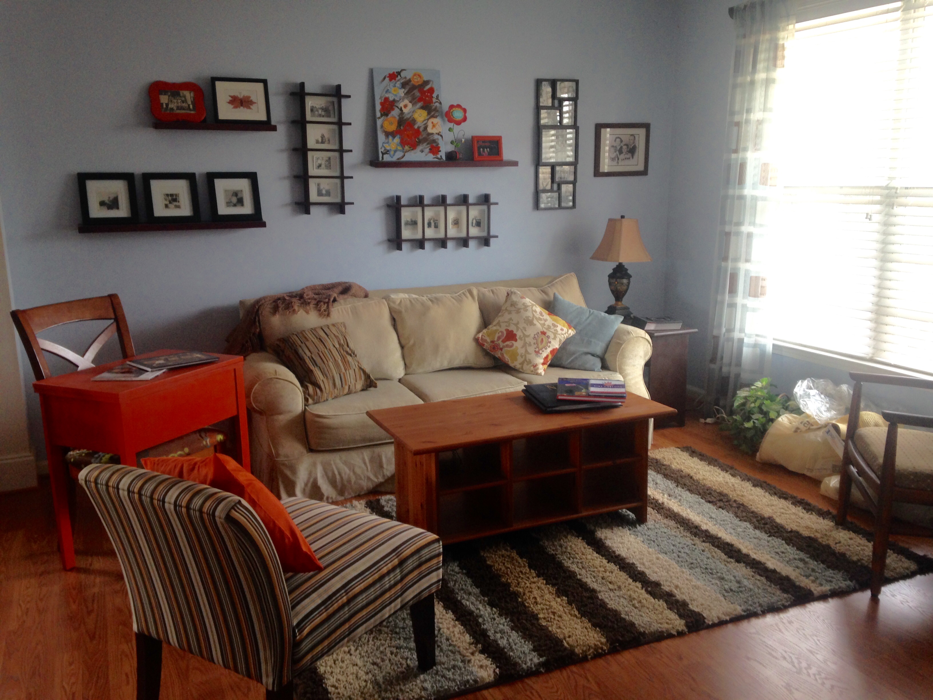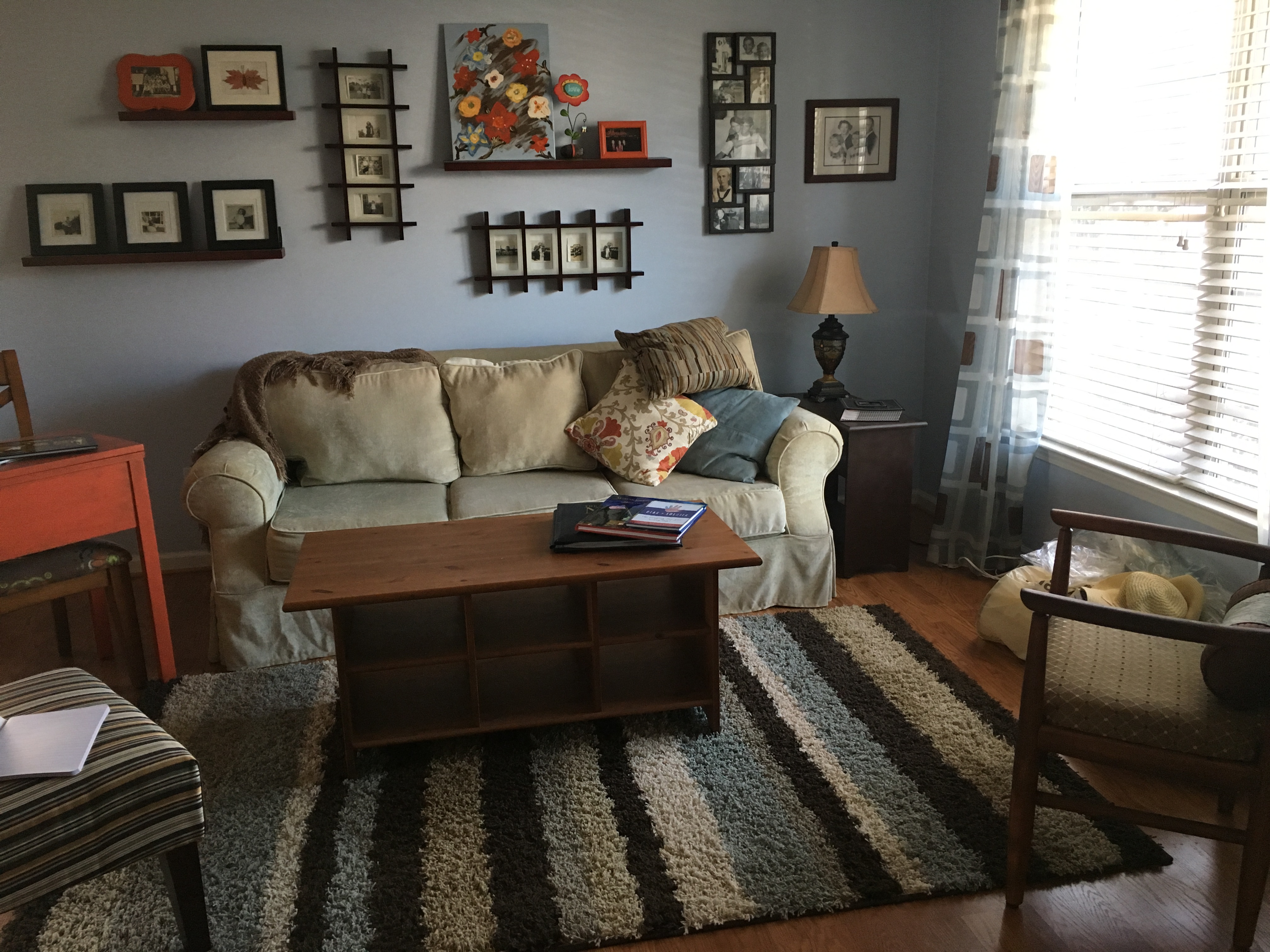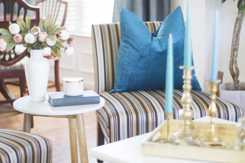 I have had the opportunity to work with all kinds of people with different budgets, size of space and style. With Cheryl, the things that were important to her were budget, finding a recliner chair and keeping the striped chairs for the space. She also decided to keep the coffee table so I recommended chalk painting it to give it a nice update.