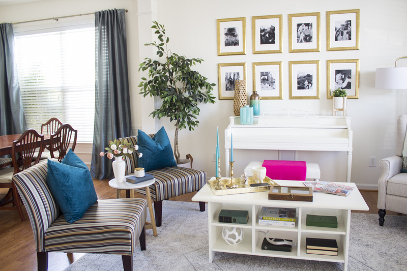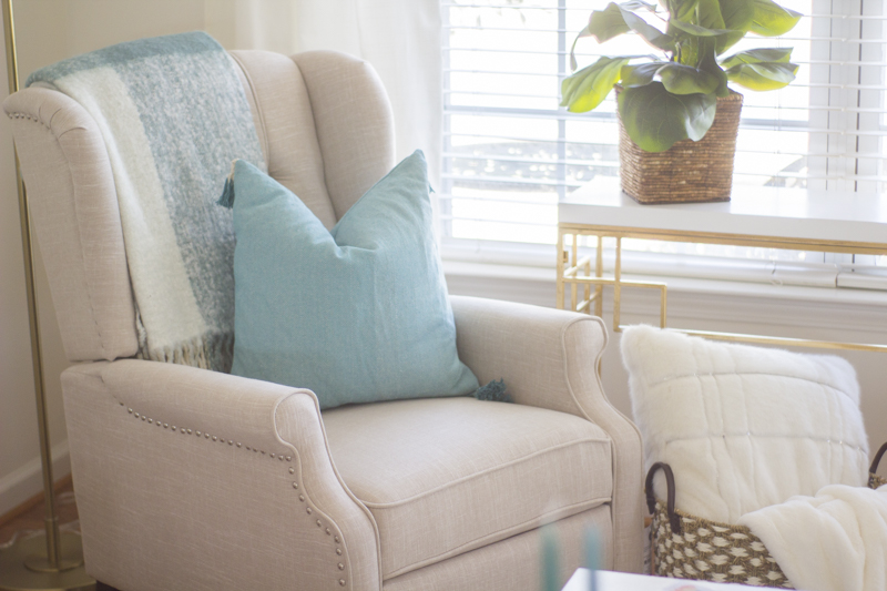 Recliner, Neutral Rug, Curtain Rod, Similar standing lamp, Gold Tray, Turquoise pillows, wooden table with marble top, Similar gold frames, Faux tall ficus tree, white orb, small real fiddle leaf tree and similar turquoise vase.