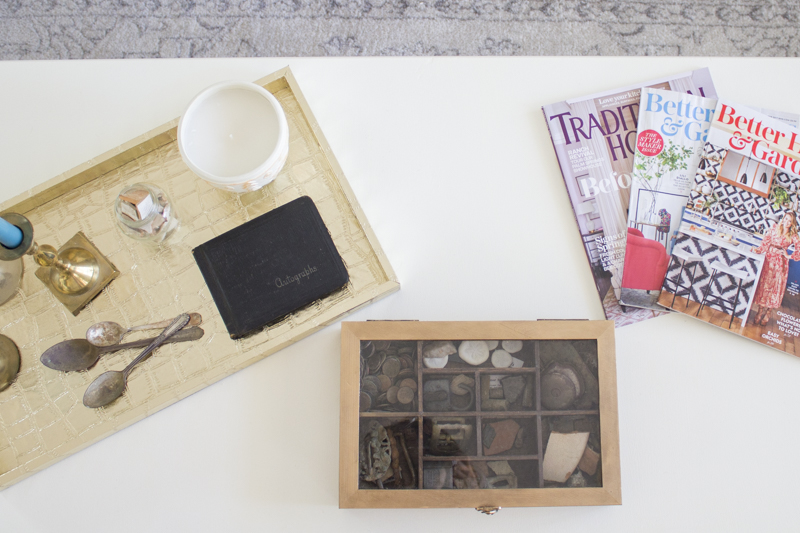 The keepsake box holds a bunch of treasures that Cheryl found while doing her favorite hobby, metal detecting. I love the antique spoons on the tray. These are all great conversational pieces and I love adding things that are sentimental and important to my clients.