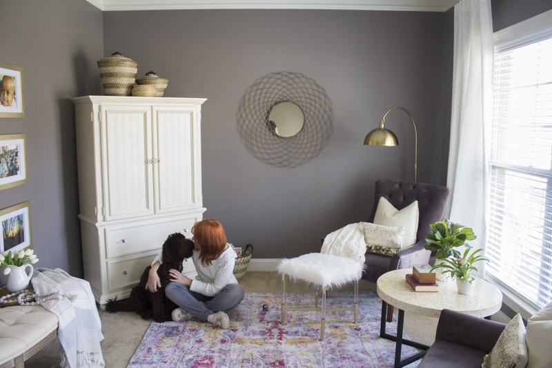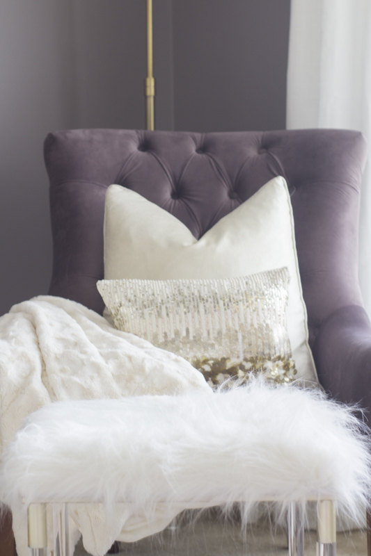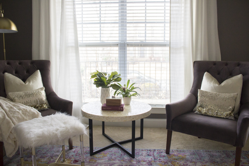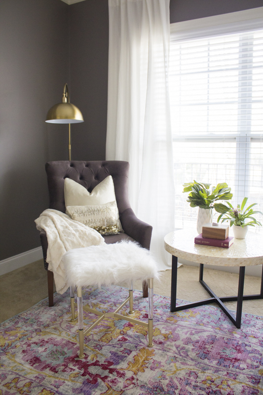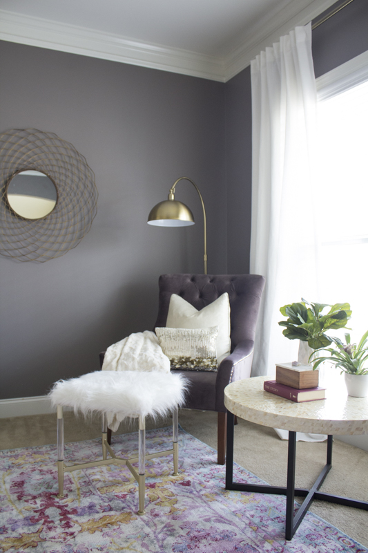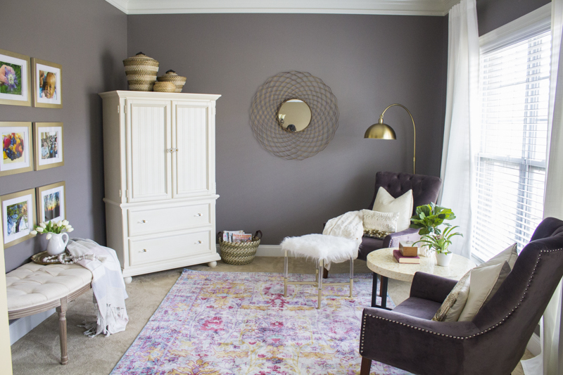 The velvet plum chairs were such a good deal and the furry ottoman gives her feet a place to rest. The coffee table was also a clearance find. Plants add color and life to this area.