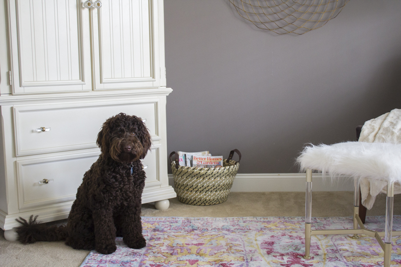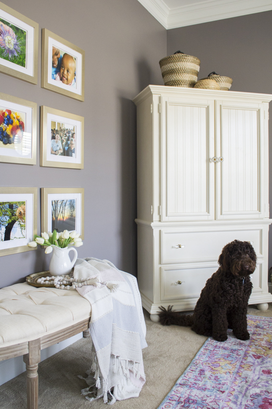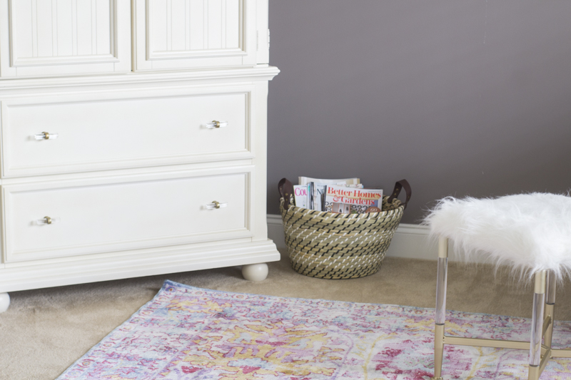 I kept it simple on top of the armoire with a trio of baskets. They add texture and height to the space. The armoire holds all of Adrienne’s reading materials. It’s safely tucked away with lots of storage for her gazillion bibles. 😀