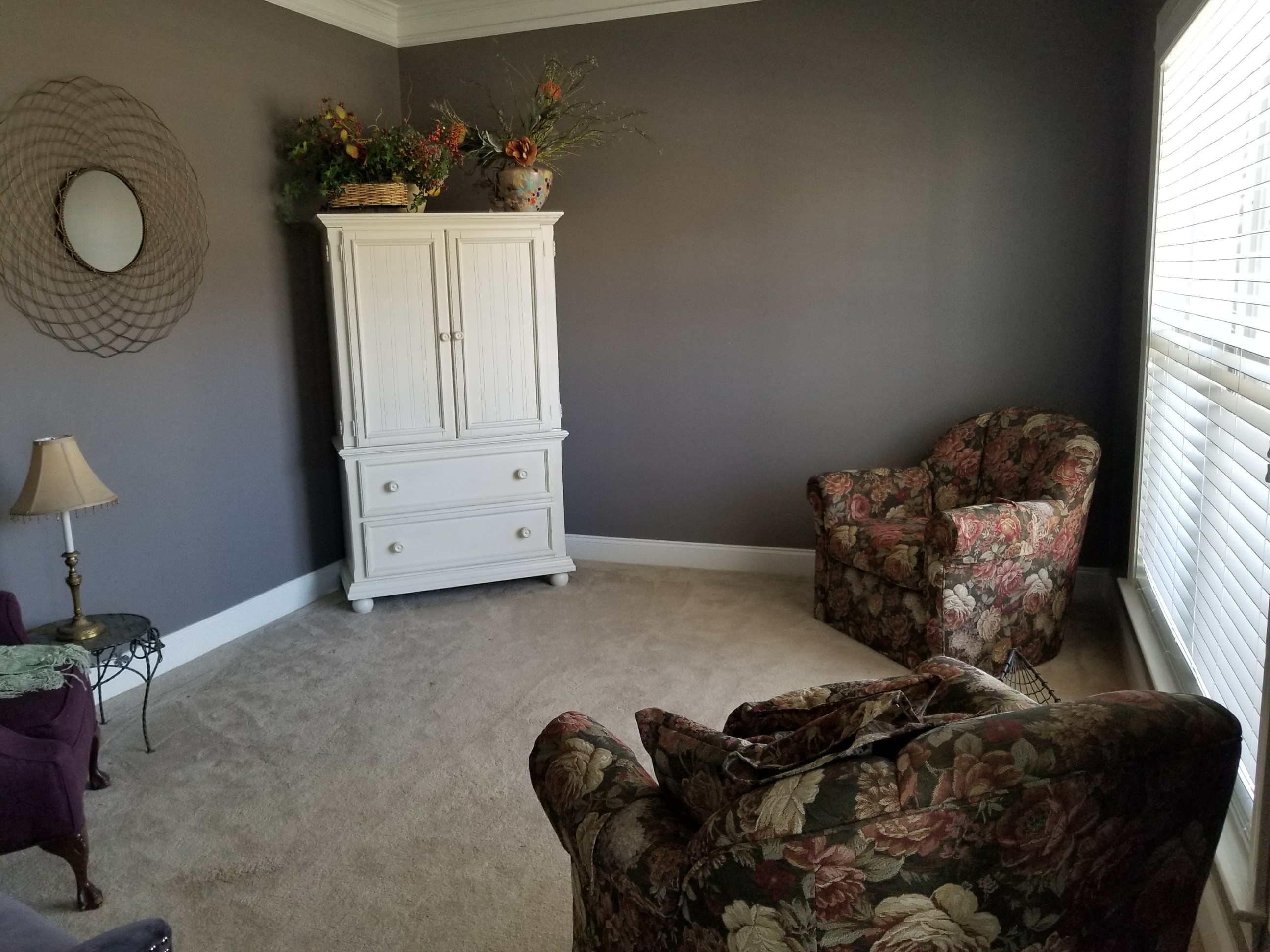 The furniture wasn’t doing anything for the pretty paint color and I really wanted that wall color to shine. It’s a lovely mix between plum, gray and blue. She gave her chairs away to her daughter’s boyfriend and we went to work in the room. We also kept the cream armoire and gold mirror but I came up with a mental plan and went to work.