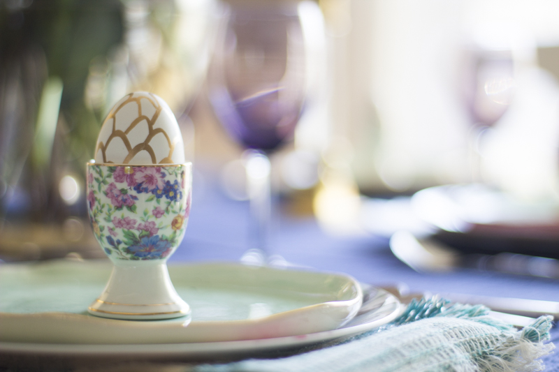 The white eggs are just plastic ones I DIY-ed last year with a gold sharpie. The little egg holders were Homegoods clearance finds post Easter last year.