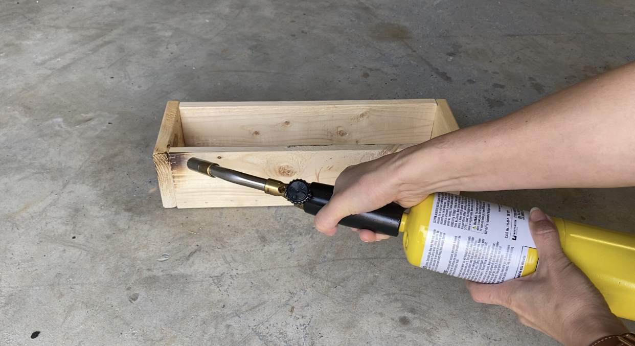 I used my Bernzomatic TS8000 and torched the wood on the exterior and interior of the box. Sand and then wipe down with a cloth. I always keep old t-shirts for projects like these.